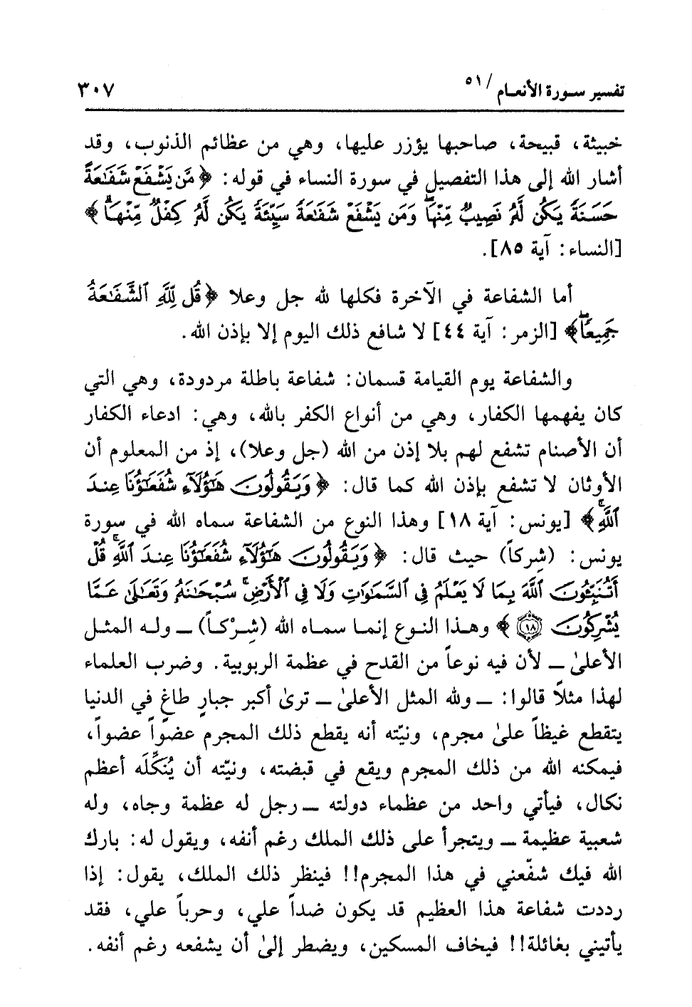 والشفاعةُ يومَ القيامةِ قِسْمَانِ: شفاعةٌ باطلةٌ مردودةٌ، وهي التي كان يفهمُها الكفارُ، وهي من أنواعِ الكفرِ بِاللَّهِ، وهي: ادعاءُ الكفارِ أن الأصنامَ تشفعُ لهم بلا إذنٍ من اللَّهِ (جل وعلا)، إِذْ من المعلومِ أن الأوثانَ لاَ تشفعُ بإذنِ اللَّهِ كما قال: {وَيَقُولُونَ هَؤُلاءِ شُفَعَاؤُنَا عِنْدَ اللَّهِ} [يونس: آية 18] وهذا النوعُ من الشفاعةِ سَمَّاهُ اللَّهُ في سورةِ يونسَ: (شِركًا) حيثُ قال: {وَيَقُولُونَ هَؤُلاءِ شُفَعَاؤُنَا عِنْدَ اللَّهِ قُلْ أَتُنَبِّئُونَ اللَّهَ بِمَا لاَ يَعْلَمُ فِي السَّمَاوَاتِ وَلاَ فِي الأَرْضِ سُبْحَانَهُ وَتَعَالَى عَمَّا يُشْرِكُونَ} وهذا النوعُ إنما سَمَّاهُ اللَّهُ (شِرْكًا) - وله المثلُ الأعلى - لأن فيه نوعًا من القَدْحِ في عظمةِ الربوبيةِ. وَضَرَبَ العلماءُ لهذا مثلاً قالوا: - وَلِلَّهِ المثلُ الأَعْلَى - ترى أكبرَ جَبَّارٍ طَاغٍ في الدنيا يتقطعُ غَيْظًا على مُجْرِمٍ، ونيتُه أنه يُقَطِّعَ ذلك المجرمَ عضوًا عضوًا، فيمكنُه اللَّهُ من ذلك المجرمِ ويقعُ في قبضتِه، ونيتُه أن يُنَكِّلَهُ أعظمَ نكالٍ، فيأتي واحدٌ من عظماءِ دولتِه - رجلٌ له عظمةٌ وجاهٌ، وله شعبيةٌ عظيمةٌ - ويتجرأُ على ذلك الملكِ
