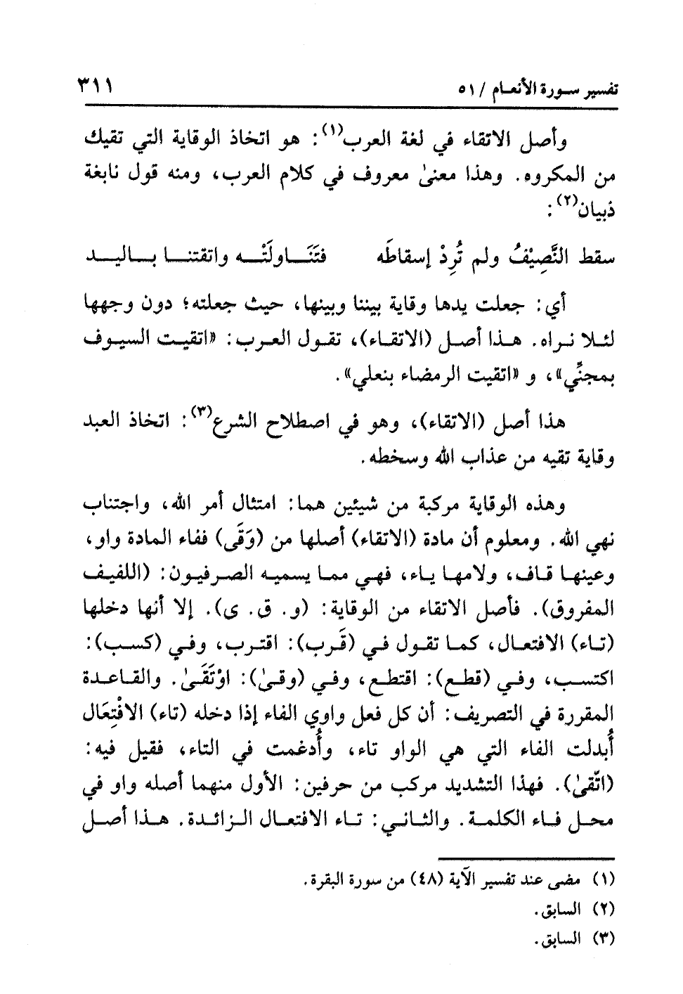 هذا أصلُ (الاتقاءِ)، وهو في اصطلاحِ الشرعِ (¬3): اتخاذُ العبدِ وقايةً تَقِيهِ مِنْ عذابِ اللَّهِ وَسَخَطِهِ.