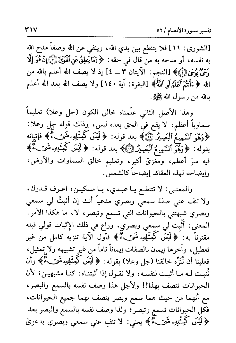 [الشورى: 11] فلا يَتَنَطَّعُ بَيْنَ يَدَيِ اللَّهِ، وينفي عن اللَّهِ وصفًا مدحَ اللَّهُ به نفسَه، أو مَدَحَهُ به مَنْ قال في حَقِّهِ: {وَمَا يَنْطِقُ عَنِ الْهَوَى (3) إِنْ هُوَ إِلا وَحْيٌ يُوحَى (4)} [النجم: الآيتان 3 - 4] إِذْ لا يصفُ اللَّهَ أعلمُ بِاللَّهِ مِنَ اللَّهِ: {أَأَنتُمْ أَعْلَمُ أَمِ اللَّهُ} [البقرة: آية 140] ولا يصفُ اللَّهَ بعدَ اللَّهِ أعلمُ باللَّهِ من رسولِ اللَّهِ - صلى الله عليه وسلم -.
