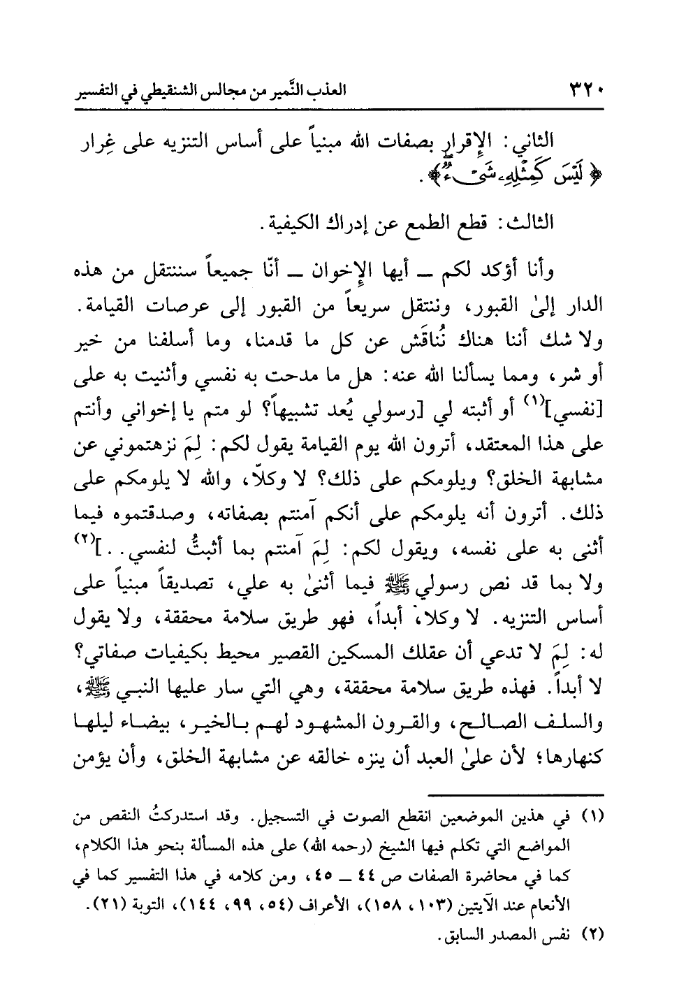 (¬1) في هذين الموضعين انقطع الصوت في التسجيل. وقد استدركتُ النقص من المواضع التي تكلم فيها الشيخ (رحمه الله) على هذه المسألة بنحو هذا الكلام، كما في محاضرة الصفات ص44 - 45، ومن كلامه في هذا التفسير كما في الأنعام عند الآيتين (103، 158)، الأعراف (54، 99، 144)، التوبة (21).