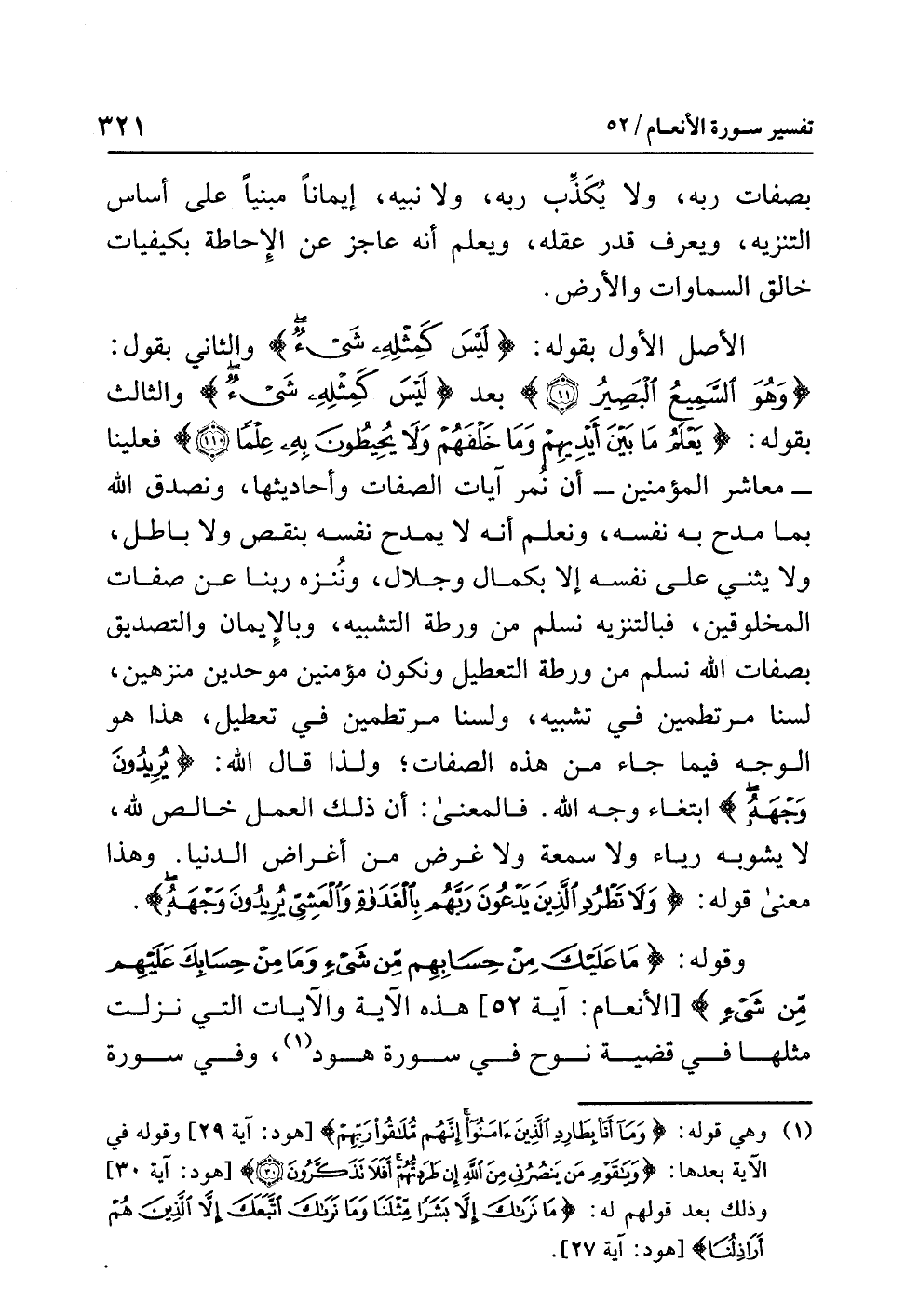 الأصلُ الأولُ بقولِه: {لَيْسَ كَمِثْلِهِ شَيْءٌ} والثاني بقولِ: {وَهُوَ السَّمِيعُ البَصِيرُ} بعدَ {لَيْسَ كَمِثْلِهِ شَيْءٌ} والثالثُ بقولِه: {يَعْلَمُ مَا بَيْنَ أَيْدِيهِمْ وَمَا خَلْفَهُمْ وَلَا يُحِيطُونَ بِهِ عِلْمًا} فَعَلَيْنَا - معاشرَ المؤمنين - أن نُمِرَّ آياتِ الصفاتِ وأحاديثَها، ونصدقَ اللَّهَ بما مَدَحَ به نفسَه، ونعلمَ أنه لا يمدحُ نفسَه بنقصٍ ولا باطلٍ، ولا يُثْنِي على نفسِه إلا بكمالٍ وجلالٍ، ونُنَزِّهَ ربَّنا عن صفاتِ المخلوقين، فبالتنزيهُ نَسْلَمُ من ورطةِ التشبيهِ، وبالإيمانِ والتصديقِ بصفاتِ اللَّهِ نَسْلَمُ من ورطةِ التعطيلِ ونكون مؤمنين موحدين منزهين، لسنا مُرْتَطِمِينَ في تشبيهٍ، ولسنا مرتطمين في تعطيلٍ، هذا هو الوجهُ فيما جاءَ من هذه الصفاتِ؛ وَلِذَا قال اللَّهُ: {يُرِيدُونَ وَجْهَهُ} ابتغاءَ وجهِ اللَّهِ. فالمعنَى: أن ذلك العملَ خالصٌ لِلَّهِ، لا يشوبُه رياءٌ ولا سُمْعَةٌ ولا غَرَضٌ من أغراضِ الدنيا. وهذا معنى قولِه: {وَلاَ تَطْرُدِ الَّذِينَ يَدْعُونَ رَبَّهُم بِالْغَدَاةِ وَالْعَشِيِّ يُرِيدُونَ وَجْهَهُ}.