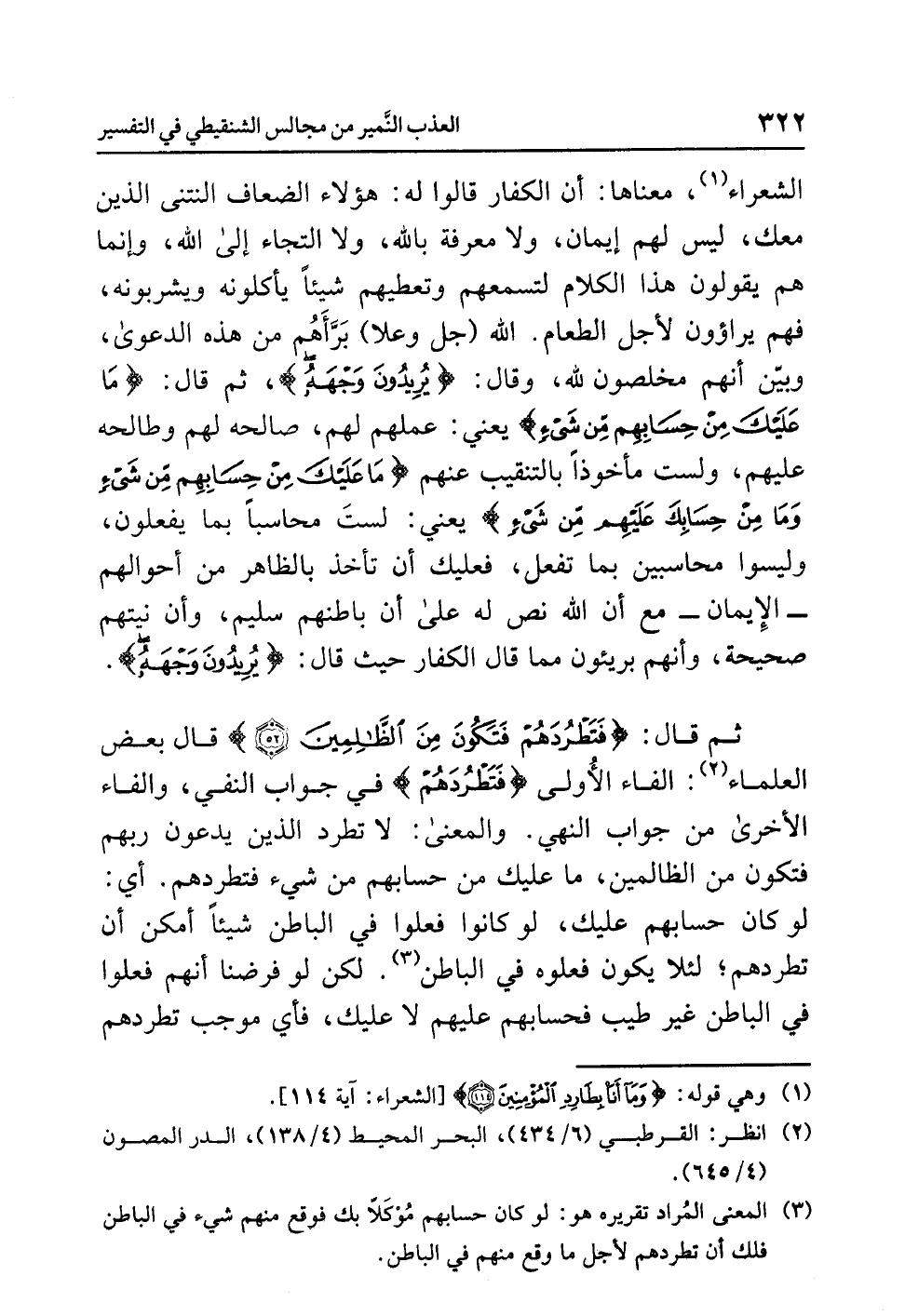 الشعراءِ (¬1)، معناها: أن الكفارَ قالوا له: هؤلاء الضعافُ النَّتْنَى الذين مَعَكَ، ليس لهم إيمانٌ، ولا معرفةٌ بالله، ولا التجاءٌ إلى الله، وإنما هم يقولونَ هذا الكلامَ لِتَسْمَعَهُمْ وتعطيَهم شيئًا يأكلونه ويشربونه، فَهُمْ يراؤونَ لأجلِ الطعامِ. اللَّهُ (جل وعلا) بَرَّأَهُمْ من هذه الدعوى، وَبَيَّنَ أنهم مُخْلِصُونَ لِلَّهِ، وقال: {يُرِيدُونَ وَجْهَهُ} ثم قال: {مَا عَلَيْكَ مِنْ حِسَابِهِم مِّن شَيْءٍ} يعني: عَمَلُهُمْ لهم، صَالِحُهُ لهم وَطَالِحُهُ عليهم، ولستَ مأخوذًا بالتنقيبِ عنهم: {مَا عَلَيْكَ مِنْ حِسَابِهِم مِّن شَيْءٍ وَمَا مِنْ حِسَابِكَ عَلَيْهِم مِّنْ شَيْءٍ} يعني: لستَ مُحَاسَبًا بما يفعلونَ، وليسوا مُحَاسَبِينَ بما تفعلُ، فعليكَ أن تأخذَ بالظاهرِ من أحوالِهم - الإيمان - مع أن الله نَصَّ له على أن باطنَهم سليمٌ، وأن نِيَّتَهُمْ صحيحةٌ، وأنهم بَرِيئُونَ مما قَالَ الكفارُ حيث قال: {يُرِيدُونَ وَجْهَهُ}.