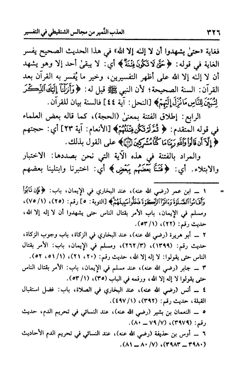فغايةُ «حَتَّى يَشْهَدُوا أَنْ لاَ إِلَهَ إِلاَّ اللَّهُ» في هذا الحديثِ الصحيحِ يُفَسِّرُ الغايةَ في قولِه: {حَتَّى لاَ تَكُونَ فِتْنَةٌ} أي: لاَ يَبْقَى أحدٌ إلا وهو يشهدُ أَنْ لاَ إِلَهَ إِلاَّ اللَّهُ على أظهرِ التفسيرين، وخيرُ ما يُفَسَّرُ به القرآنُ بعدَ القرآنِ: السنةُ الصحيحةُ؛ لأَنَّ النبيَّ - صلى الله عليه وسلم - قِيلَ له: {وَأَنزَلْنَا إِلَيْكَ الذِّكْرَ لِتُبَيِّنَ لِلنَّاسِ مَا نُزِّلَ إِلَيْهِمْ} [النحل: آية 44] فالسنةُ بيانٌ للقرآنِ.