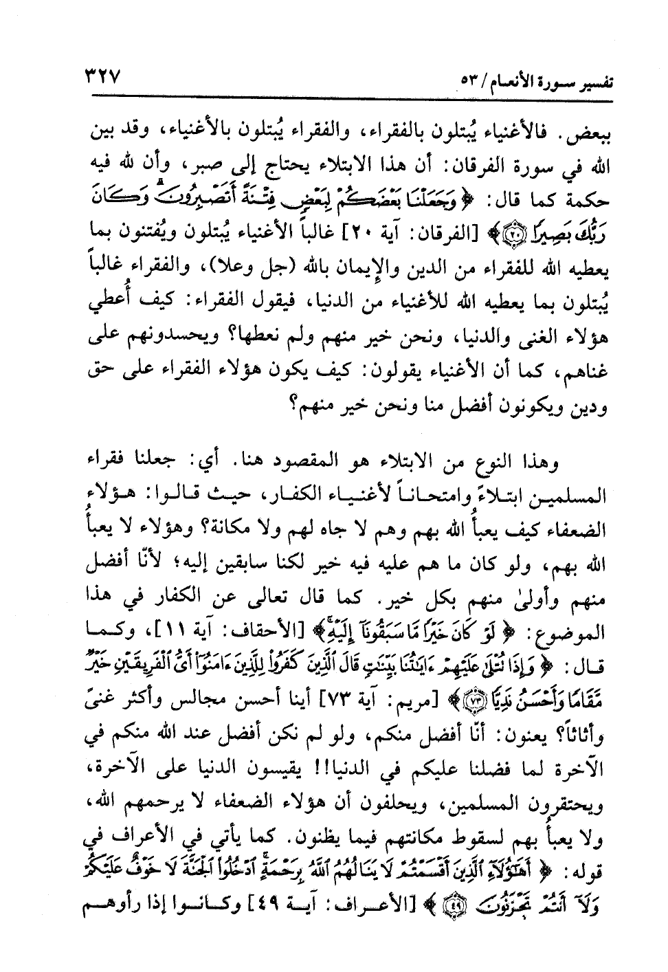 ببعضٍ. فالأغنياءُ يُبْتَلَوْنَ بالفقراءِ، والفقراءُ يُبْتَلَوْنَ بالأغنياءِ، وقد بَيَّنَ اللَّهُ في سورةِ الفرقانِ: أن هذا الابتلاءَ يحتاجُ إلى صبرٍ، وأن لله فيه حكمةً كما قال: {وَجَعَلْنَا بَعْضَكُمْ لِبَعْضٍ فِتْنَةً أَتَصْبِرُونَ وَكَانَ رَبُّكَ بَصِيرًا} [الفرقان: آية 20] غالبًا الأغنياءُ يُبْتَلَوْنَ وَيُفْتَنُونَ بما يُعْطِيهِ اللَّهُ للفقراءِ من الدِّينِ والإيمانِ بِاللَّهِ (جل وعلا)، والفقراءُ غَالِبًا يُبتلون بما يعطيه اللَّهُ للأغنياءِ من الدنيا، فيقولُ الفقراءُ: كيف أُعْطِيَ هؤلاء الغنَى والدنيا، ونحن خيرٌ منهم ولم نُعْطَهَا؟ وَيَحْسُدُونَهُمْ على غِنَاهُمْ، كما أن الأغنياءَ يَقُولُونَ: كيف يكونُ هؤلاء الفقراءُ على حَقٍّ وَدِينٍ ويكونون أفضلَ منا ونحن خيرٌ منهم؟