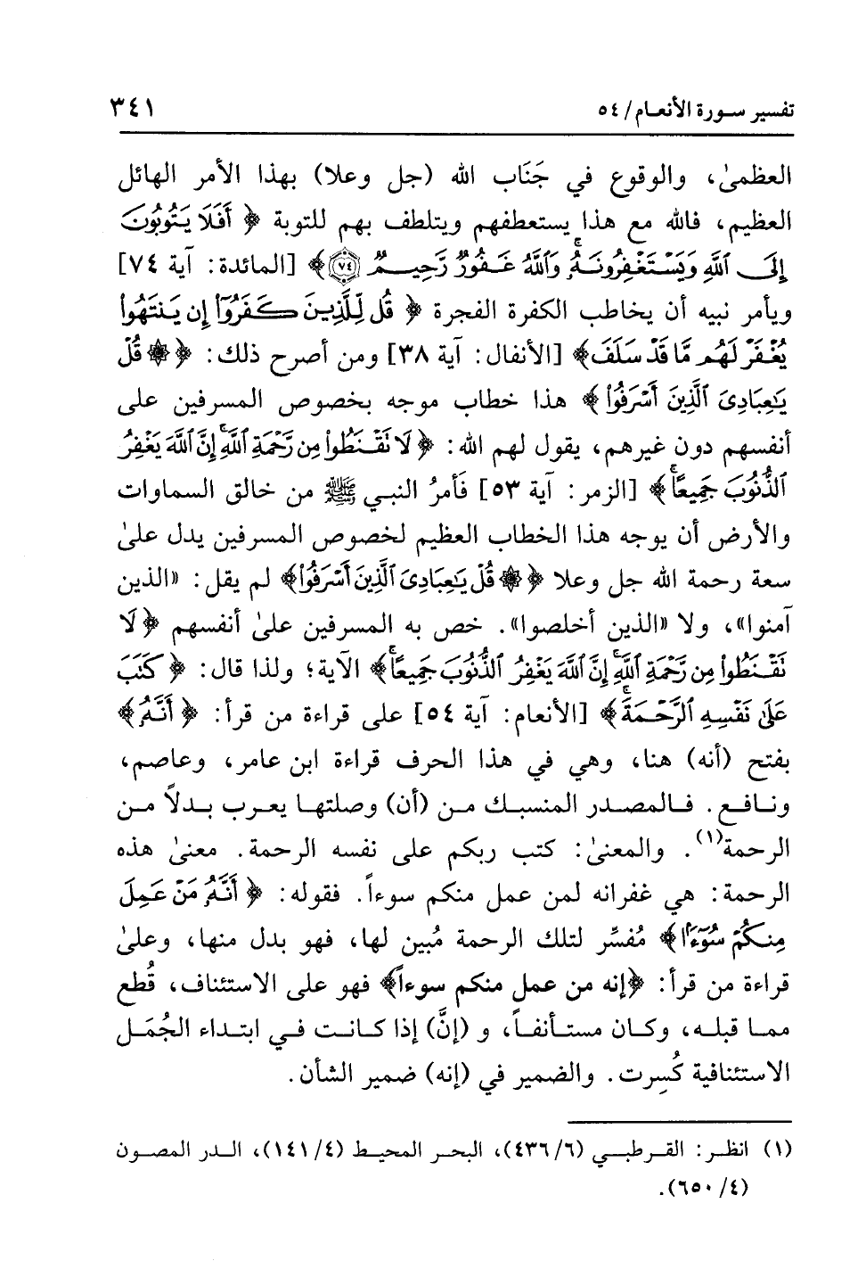 الْعُظْمَى والوقوعِ في جَنَابِ اللَّهِ (جل وعلا) بهذا الأمرِ الهائلِ العظيمِ، فَاللَّهُ مع هذا يستعطفُهم ويتلطفُ بهم للتوبةِ: {أَفَلاَ يَتُوبُونَ إِلَى اللَّهِ وَيَسْتَغْفِرُونَهُ وَاللَّهُ غَفُورٌ رَّحِيمٌ} [المائدة: آية 74] ويأمرُ نَبِيَّهُ أن يخاطبَ الكفرةَ الفجرةَ: {قُلْ لِلَّذِينَ كَفَرُوا إِنْ يَنْتَهُوا يُغَفَرْ لَهُم مَّا قَدْ سَلَفَ} [الأنفال: آية 38] وَمِنْ أَصْرَحِ ذلك: {قُلْ يَا عِبَادِيَ الَّذِينَ أَسْرَفُوا} هذا خطابٌ مُوَجَّهٌ بخصوصِ الْمُسْرِفِينَ على أنفسِهم دونَ غيرِهم، يقولُ لهم اللَّهُ: {لاَ تَقْنَطُوا مِن رَّحْمَةِ اللَّهِ إِنَّ اللَّهَ يَغْفِرُ الذُّنُوبَ جَمِيعًا} [الزمر: آية 53] فَأَمْرُ النبيِّ - صلى الله عليه وسلم - من خالقِ السماوات والأرض أن يُوَجِّهَ هذا الخطابَ العظيمَ لخصوصِ المسرفين يدلُّ على سَعَةِ رحمةِ اللَّهِ جل وعلا: {قُلْ يَا عِبَادِيَ الَّذِينَ أَسْرَفُوا} لم يَقُلْ: «الذين آمنوا»، ولا «الذين أَخْلَصُوا». خَصَّ به المسرفين على أنفسِهم {لاَ تَقْنَطُوا مِن رَّحْمَةِ اللَّهِ إِنَّ اللَّهَ يَغْفِرُ الذُّنُوبَ جَمِيعًا} الآيةَ؛ وَلِذَا قال: {كَتَبَ رَبكُم عَلَى نَفْسِهِ الرَّحْمَةَ} [الأنعام: آية 54] على قراءةِ مَنْ قَرَأَ: {أَنَّهُ} بفتحِ (أنه) هنا، وهي في هذا الحرفِ قراءةُ ابنِ عامرٍ وعاصمٍ ونافعٍ. فالمصدرُ المنسبكُ من (أن) وصلتِها يُعْرَبُ بدلاً من الرحمةِ (¬1). والمعنَى: كَتَبَ رَبُّكُمْ على نفسِه الرحمةَ. معنى هذه الرحمةِ: هي غفرانُه لمن عَمِلَ منكم سوءًا. فقولُه: {أَنَّهُ مَنْ عَمِلَ مِنكُمْ سُوءًا} مُفسِّرٌ لتلك الرحمةِ مُبَيِّنٌ لها، فهو بدلٌ منها، وعلى قراءةِ مَنْ قَرَأَ: {إِنَّهُ من عمل منكم سوءا} فهو على الاستئنافِ قُطِعَ مِمَّا قَبْلَهُ، وكان مُسْتَأْنَفًا، و (إِنَّ) إذا كانت في ابتداءِ الْجُمَلِ الاستئنافيةِ كُسِرَتْ. والضميرُ في (إنه) ضميرُ الشأنِ.