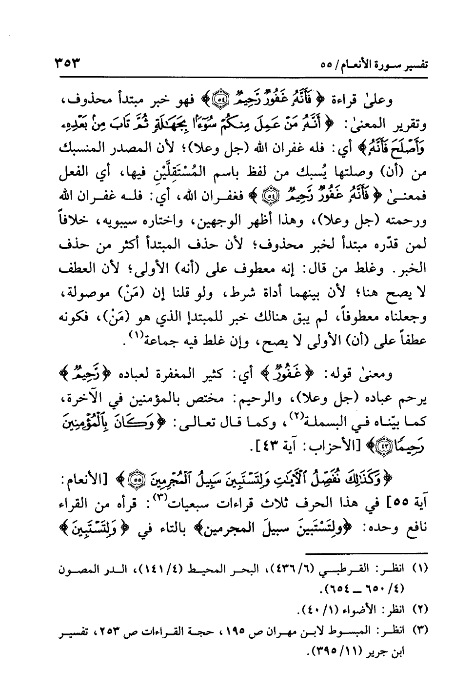 وعلى قراءةِ: {فَأَنَّهُ غَفُورٌ رَّحِيمٌ} فهو خبرُ مبتدأٍ محذوفٍ، وتقريرُ المعنى: {أَنَّهُ مَنْ عَمِلَ مِنكُمْ سُوءاً بِجَهَالَةٍ ثُمَّ تَابَ مِنْ بَعْدِهِ وَأَصْلَحَ فَأَنَّهُ} أي: فَلَهُ غفرانُ اللَّهِ (جل وعلا)؛ لأن المصدرَ المنسبكَ من (أن) وصلتَها يُسْبَكُ من لفظٍ باسم المُسْتَقِلَيْنِ فيها، أي: الفعل، فمعنى {فَأَنَّهُ غَفُورٌ رَّحِيمٌ} فغفرانُ اللَّهِ، أي: فَلَهُ غفرانُ اللَّهِ ورحمتُه (جل وعلا)، وهذا أظهرُ الْوَجْهَيْنِ، واختارَه سيبويه، خلافًا لمن قَدَّرَهُ مبتدأً لخبرٍ محذوفٍ؛ لأن حذفَ المبتدأِ أكثرُ من حذفِ الخبرِ. وَغَلِطَ مَنْ قال: إنه معطوفٌ على (أنه) الأُولَى؛ لأن العطفَ لا يصحُّ هنا؛ لأن بينهما أداةَ شرطٍ، ولو قلنا إن (مَنْ) مَوْصُولَةٌ، وجعلناه معطوفًا، لم يَبْقَ هنالك خبرٌ للمبتدأِ الذي هو (مَنْ)، فكونُه عطفًا على (أن) الأُولَى لا يصحُّ، وإن غَلِطَ فيه جماعةٌ (¬1).