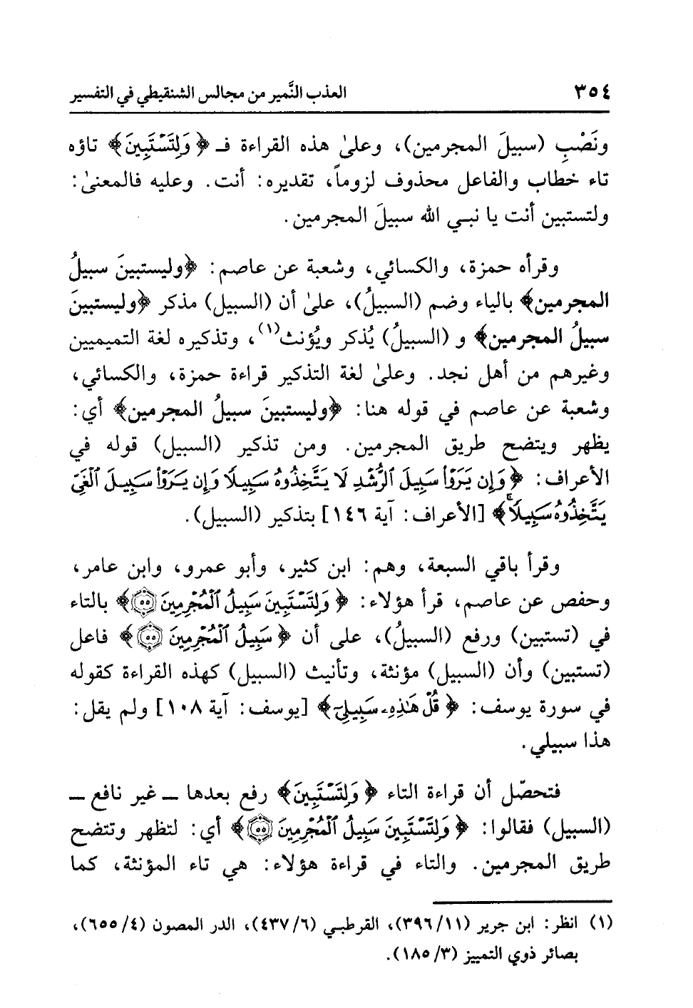 فَتَحَصَّلَ أن قراءةَ التاءِ: {وَلِتَسْتَبِينَ} رَفَعَ بعدَها - غيرَ نافعٍ - (السبيل) فقالوا: {وَلِتَسْتَبِينَ سَبِيلُ الْمُجْرِمِينَ} أي: لتظهرَ وتتضحَ طريقُ الْمُجْرِمِينَ. والتاءُ في قراءةِ هؤلاء: هي تاءُ المؤنثةِ، كما