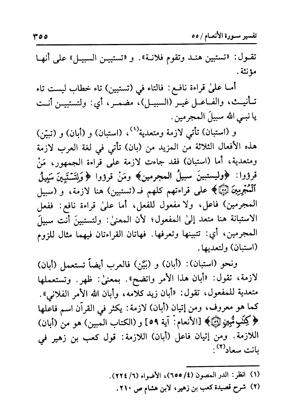 و (اسْتَبَانَ) تأتي لازمةً ومتعديةً (¬1)، (اسْتَبَانَ) و (أَبَانَ) و (تَبَيَّنَ) هذه الأفعالُ الثلاثةُ من المزيدِ من (بَانَ) تأتي في لغةِ العربِ لازمةً ومتعديةً، أما (اسْتَبَانَ) فقد جاءت لازمةً على قراءةِ الجمهورِ، مَنْ قَرَؤُوا: {وليستبينَ سبيلُ المجرمين} ومَنْ قرؤوا {وَلِتَسْتَبِينَ سَبِيلُ الْمُجْرِمِينَ} على قراءتِهم كلهم فـ (تستبين) هنا لازمةٌ، و (سبيل المجرمين) فاعلٌ، ولا مفعولَ للفعلِ، أما على قراءةِ نافعٍ: ففعلُ الاستبانةِ هنا مُتَعَدٍّ إلى المفعولِ؛ لأن المعنَى: ولتستبينَ أَنْتَ سبيلَ الْمُجْرِمِينَ، أي: تَتَبَيَّنَهَا وتعرفَها. فهاتانِ القراءتانِ فيهما مثالٌ للزومِ (استبان) وَلِتَعَدِّيهَا.