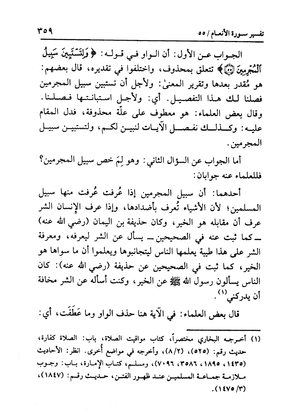 الجوابُ عن الأولِ: أن الواوَ في قولِه: {وَلِتَسْتَبِينَ سَبِيلُ الْمُجْرِمِينَ} تتعلقُ بمحذوفٍ، واختلفوا في تقديرِه، قال بعضُهم: هو مُقَدَّرٌ بعدَها، وتقريرُ المعنى: ولأَجْلِ أن تستبينَ سبيلُ المجرمين فَصَّلْنَا لكَ هذا التفصيلَ. أي: ولأَجْلِ استبانتِها فَصَّلْنَا. وقال بعضُ العلماءِ: هو معطوفٌ على عِلَّةٍ محذوفةٍ، فدل المقامُ عليه: وكذلك نفصلُ الآياتِ لنبينَ لكم، ولتستبينَ سبيلُ المجرمين.