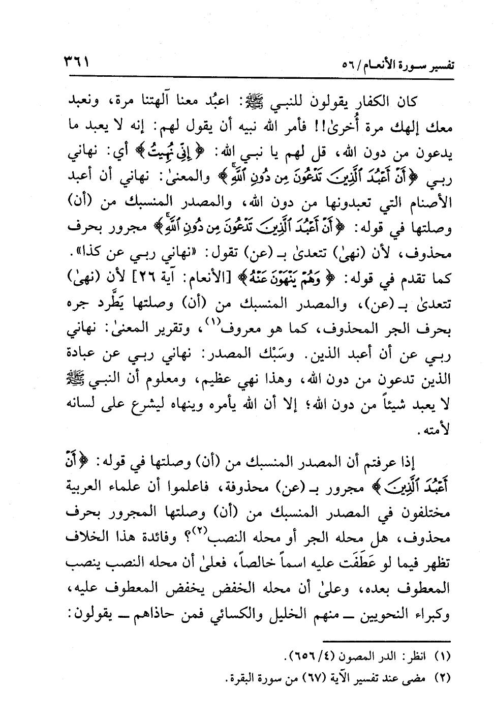 إذا عَرَفْتُمْ أن المصدرَ المنسبكَ من (أن) وصلتِها في قولِه: {أَنْ أَعْبُدَ الَّذِينَ} مجرورٌ بـ (عن) محذوفةٍ، فَاعْلَمُوا أن علماءَ العربيةِ مختلفونَ في المصدرِ المنسبكِ من (أن) وصلتِها المجرورِ بحرفٍ محذوفٍ، هل مَحَلُّهُ الجرُّ أو محلُّه النصبُ (¬2)؟ وفائدةُ هذا الخلافِ تظهرُ فيما لو عَطَفْتَ عليه اسمًا خَالِصًا، فعلى أن محلَّه النصبَ يُنْصَبُ المعطوفُ بعدَه، وعلى أن محلَّه الخفضَ يُخْفَضُ المعطوفُ عليه، وكبراءُ النحويين - منهم الخليلُ والكسائيُّ فمن حاذاهم - يقولون: