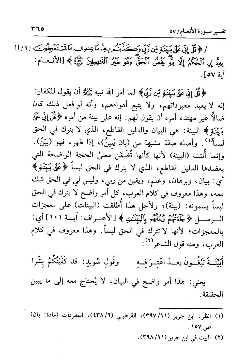 {قُلْ إِنِّي عَلَى بَيِّنَةٍ مِّن رَّبِّي} لَمَّا أَمَرَ اللَّهُ نِبِيَّهُ - صلى الله عليه وسلم - أن يقولَ للكفارِ: إنه لا يعبدُ معبوداتِهم، ولا يتبعُ أهواءَهم، وأنه لو فَعَلَ ذلك كان ضَالاًّ غيرَ مُهْتَدٍ، أَمَرَهُ أن يقولَ لهم: إنه على بينةٍ من أَمْرِهِ {قُلْ إِنِّي عَلَى بَيِّنَةٍ} البينةُ: هي البيانُ والدليلُ القاطعُ، الذي لا يتركُ في الحقِّ لَبْسًا (¬1). وأصلُه صفةٌ مشبهةٌ من (بَانَ يَبِينُ)، إذا ظَهَرَ، فهو (بَيِّنٌ). وإنما أُنِّثَتِ (البينةُ) لأنها كأنها تُضَمَّنُ معنَى الحجةِ الواضحةِ التي يُعَضِّدُهَا الدليلُ القاطعُ، الذي لا يتركُ في الحقِّ لَبْسًا {عَلَى بَيِّنَةٍ} أي: بيانٍ وبرهانٍ وعلمٍ ويقينٍ من رَبِّي، وليس لِي في الحقِّ شكٌّ معه، وهذا معروفٌ في كلامِ العربِ، كُلُّ أَمْرٍ واضح لا يتركُ في الحقِّ لَبْسًا يسمونه: (بينةً)؛ ولأجلِ هذا أُطْلِقَتِ (البيناتُ) على معجزاتِ الرسلِ {جَاءتْهُمْ رُسُلُهُم بِالْبَيِّنَاتِ} [الأعراف: آية 101] أي: بالمعجزاتِ؛ لأنها لا تتركُ في الحقِّ لَبْسًا. وهذا معروفٌ في كلامِ العربِ، ومنه قولُ الشاعرِ (¬2):