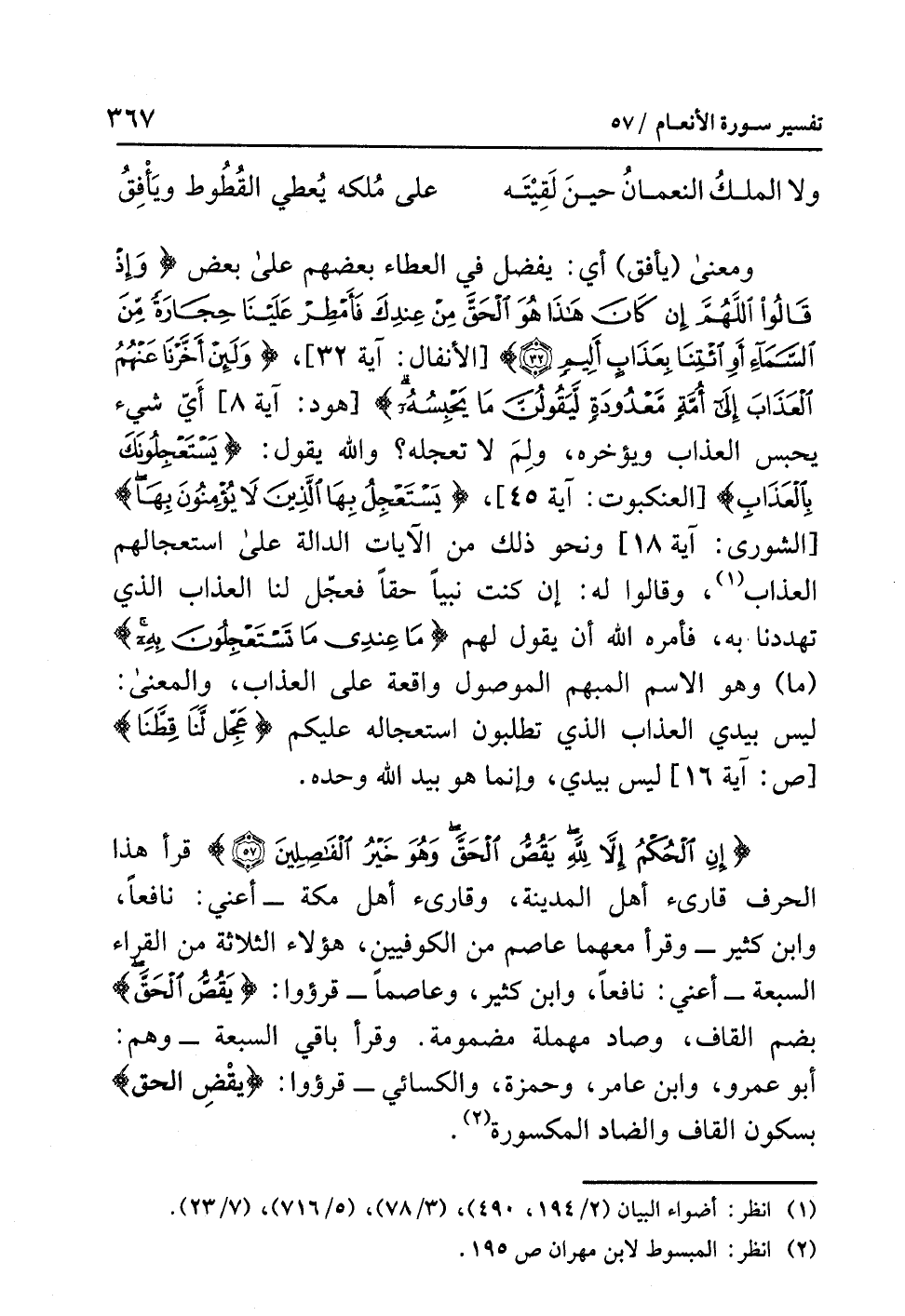 {إِنِ الْحُكْمُ إِلاَّ لِلَّهِ يَقُصُّ الْحَقَّ وَهُوَ خَيْرُ الْفَاصِلِينَ} قرأ هذا الحرفَ قارئُ أهلِ المدينةِ، وقارئُ أهلِ مكةَ - أعني: نافعًا وابنَ كثيرٍ - وقرأ معهما عاصمٌ من الكوفيين، هؤلاء الثلاثةُ من القراءِ السبعةِ - أعني: نافعاً وابنَ كثيرٍ وعاصمًا - قرؤوا: {يَقُصُّ الْحَقَّ} بِضَمِّ القافِ، وصادٍ مهملةٍ مضمومةٍ. وقرأ باقي السبعةِ - وهم: أبو عمرو وابنُ عامرٍ وحمزةُ والكسائيُّ - قرؤوا: {يقْضِ الحق} بسكونِ القافِ والضادِ المكسورةِ (¬2).