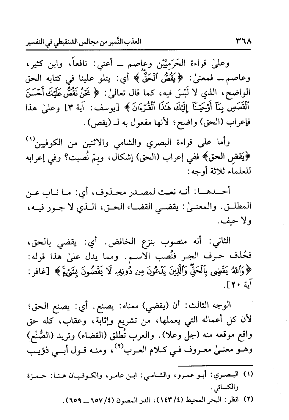 وعلى قراءةِ الحَرَمِيَّيْنِ وعاصمٍ - أعني: نافعًا وابنَ كثيرٍ، وعاصم - فمعنَى: {يَقُصُّ الْحَقَّ} أي: يَتْلُو علينا في كتابِه الحقَّ الواضحَ، الذي لاَ لَبْسَ فيه، كما قالَ تعالى: {نَحْنُ نَقُصُّ عَلَيْكَ أَحْسَنَ الْقَصَصِ بِمَا أَوْحَيْنَا إِلَيْكَ هَذَا الْقُرْآنَ} [يوسف: آية 3] وعلى هذا فإعرابُ (الحقِّ) واضحٌ؛ لأنها مفعولٌ به لـ (يقص).