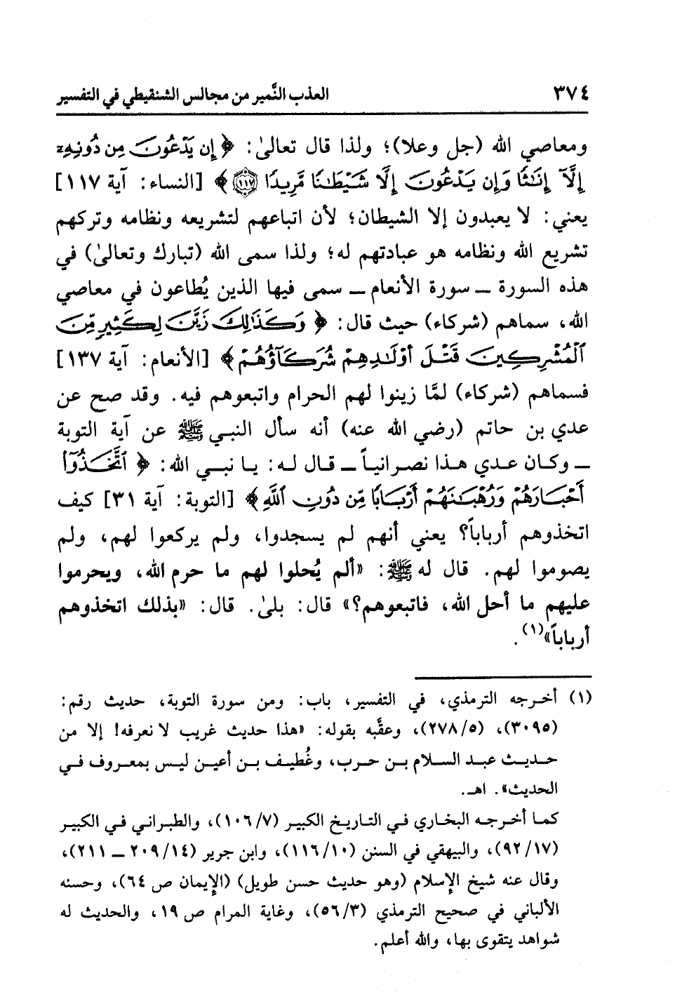 ومعاصِي الله (جل وعلا)؛ وَلِذَا قال تعالى: {إِنْ يَدْعُونَ مِنْ دُونِهِ إِلاَّ إِنَاثًا وَإِنْ يَدْعُونَ إِلاَّ شَيْطَانًا مَّرِيدًا} [النساء: آية 117] يعني: لا يَعْبُدُونَ إلا الشيطانَ؛ لأن اتباعَهم لتشريعِه ونظامِه وتركَهم تشريعَ اللَّهِ ونظامَه هو عبادتُهم له؛ وَلِذَا سَمَّى اللَّهُ (تبارك وتعالى) في هذه السورةِ - سورةِ الأنعامِ - سَمَّى فيها الذين يُطَاعُونَ في معاصِي اللَّهِ، سَمَّاهُمْ (شركاءَ) حيث قال: {وَكَذَلِكَ زَيَّنَ لِكَثِيرٍ مِّنَ الْمُشْرِكِينَ قَتْلَ أَوْلاَدِهِمْ شُرَكَاؤُهُمْ} [الأنعام: آية 137] فَسَمَّاهُمْ (شركاءَ) لَمَّا زينوا لهم الحرامَ واتبعوهم فيه. وقد صَحَّ عن عَدِيِّ بْنِ حَاتِمٍ (رضي الله عنه) أنه سألَ النبيَّ - صلى الله عليه وسلم - عن آيةِ التوبةِ - وكان عَدِيٌّ هذا نَصْرَانِيًّا - قال له: يا نَبِيَّ اللَّهِ: {اتَّخَذُوا أَحْبَارَهُمْ وَرُهْبَانَهُمْ أَرْبَابًا مِّنْ دُونِ اللَّهِ} [التوبة: آية 31] كيف اتَّخَذُوهُمْ أَرْبَابًا؟ يعني أنهم لم يَسْجُدُوا ولم يَرْكَعُوا لهم ولم يصوموا لهم. قال له - صلى الله عليه وسلم -: «أَلَمْ يُحِلُّوا لَهَمْ مَا حَرَّمَ اللَّهُ، وَيُحَرِّمُوا عَلَيْهِمْ مَا أَحَلَّ اللَّهُ، فَاتَّبَعُوهُمْ؟» قال: بَلَى. قال: «بِذَلِكَ اتَّخَذُوهُمْ أَرْبَابًا» (¬1).