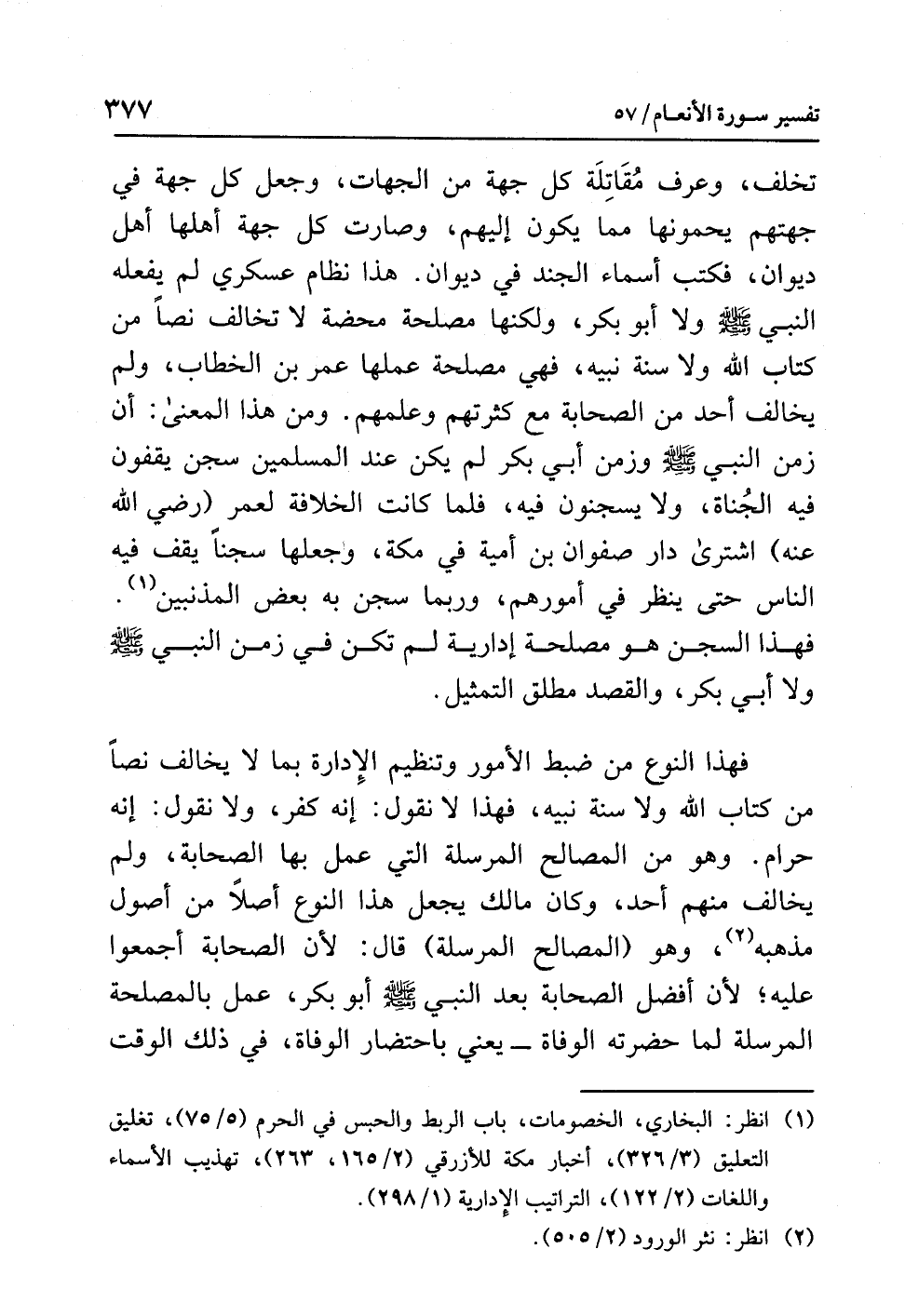 فهذا النوعُ من ضبطِ الأمورِ وتنظيمِ الإدارةِ بما لا يخالفُ نَصًّا من كتابِ اللَّهِ ولا سنةِ نَبِيِّهِ، فهذا لا نقولُ: إنه كُفْرٌ، ولا نقول: إنه حَرَامٌ. وهو من المصالحِ المرسلةِ التي عَمِلَ بها الصحابةُ، ولم يُخَالِفْ منهم أَحَدٌ، وكان مالكٌ يجعلُ هذا النوعَ أصلاً من أصولِ مَذْهَبِهِ (¬2)، وهو (الْمَصَالِحُ الْمُرْسَلَةُ) قال: لأن الصحابةَ أَجْمَعُوا عليه؛ لأن أفضلَ الصحابةِ بعدَ النبيِّ - صلى الله عليه وسلم - أبو