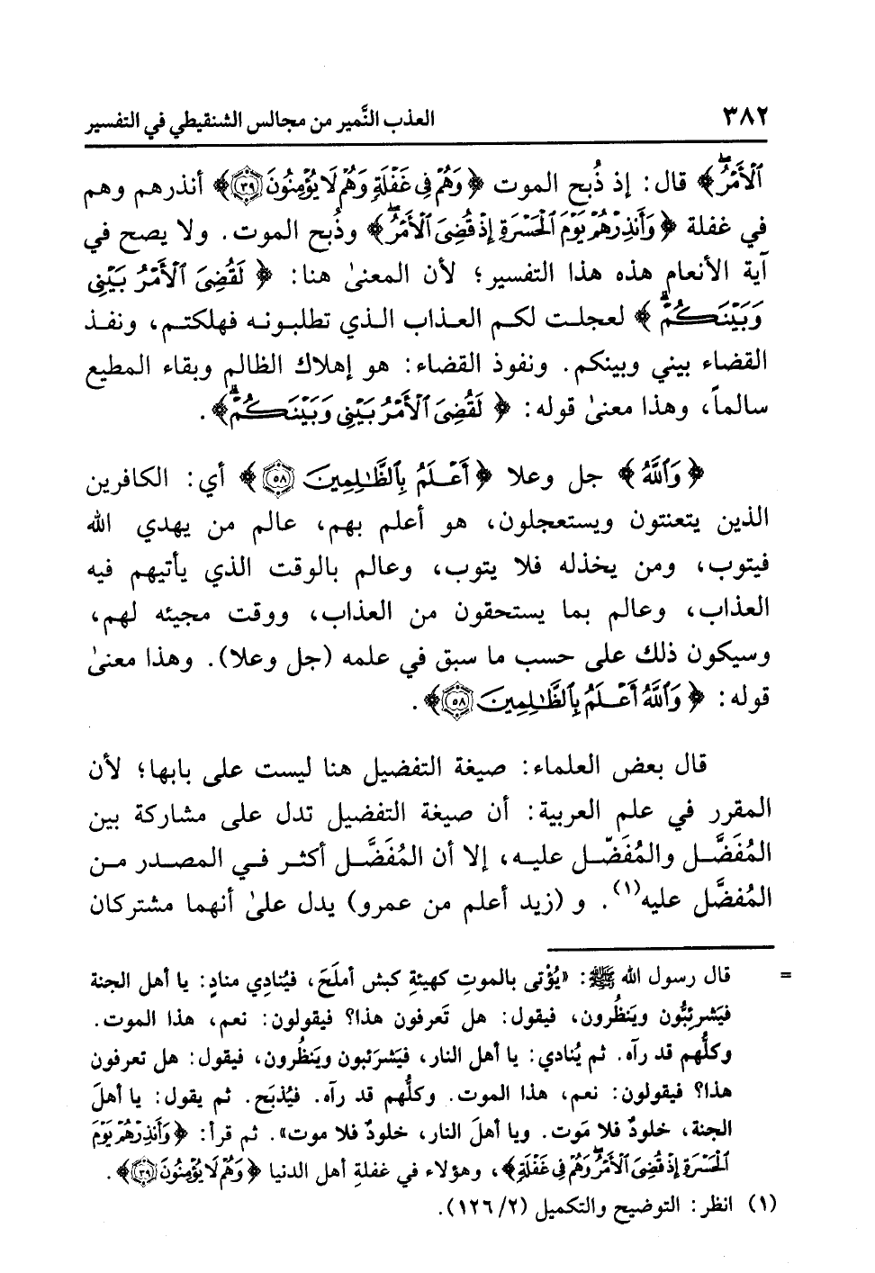 قُضِيَ الْأَمْرُ} قال: إِذْ ذُبِحَ الْمَوْتُ {وَهُمْ فِي غَفْلَةٍ وَهُمْ لاَ يُؤْمِنُونَ} أَنْذِرْهُمْ وَهُمْ في غفلةٍ {وَأَنذِرْهُمْ يَوْمَ الْحَسْرَةِ إِذْ قُضِيَ الْأَمْرُ} وَذُبِحَ الموتُ. ولا يَصِحُّ في آيةِ الأنعامِ هذه هذا التفسيرُ؛ لأن المعنَى هنا: {لَقُضِيَ الأَمْرُ بَيْنِي وَبَيْنَكُمْ} لَعَجَّلْتُ لكم العذابَ الذي تطلبونَه فَهَلَكْتُمْ، وَنَفَذَ القضاءُ بَيْنِي وبينَكم. ونفوذُ القضاءِ: هو إهلاكُ الظالمِ وبقاءُ المطيعِ سَالِمًا، وهذا معنَى قولِه: {لَقُضِيَ الأَمْرُ بَيْنِي وَبَيْنَكُمْ}.