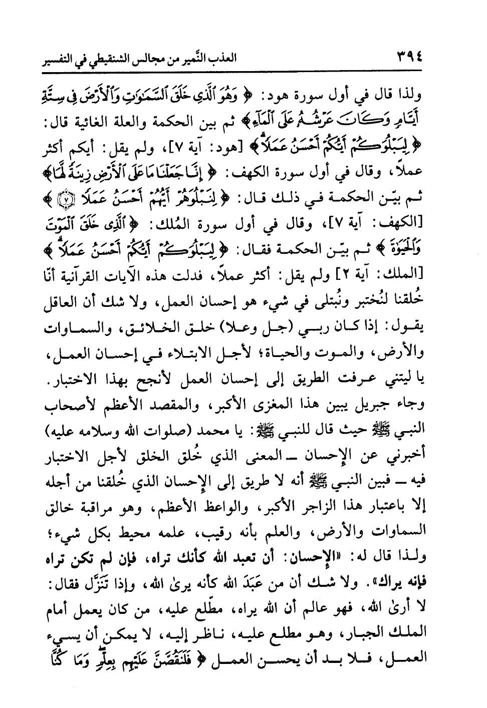 وَلِذَا قال في أولِ سورةِ هودٍ: {وَهُوَ الَّذِي خَلَقَ السَّمَاوَاتِ وَالأَرْضَ فِي سِتَّةِ أَيَّامٍ وَكَانَ عَرْشُهُ عَلَى الْمَاءِ} ثم بَيَّنَ الحكمةَ والعلةَ الغائيةَ قال: {لِيَبْلُوَكُمْ أَيُّكُمْ أَحْسَنُ عَمَلاً} [هود: آية 7] ولم يَقُلْ: أَيُّكُمْ أكثرُ عملاً، وقال في أولِ سورةِ الكهفِ: {إِنَّا جَعَلْنَا مَا عَلَى الْأَرْضِ زِينَةً لَّهَا} ثم بَيَّنَ الحكمةَ في ذلك قال: {لِنَبْلُوَهُمْ أَيُّهُمْ أَحْسَنُ عَمَلاً} [الكهف: آية 7] وقال في أولِ سورةِ الْمُلْكِ: {الَّذِي خَلَقَ الْمَوْتَ وَالْحَيَاةَ} ثُمَّ بَيَّنَ الحكمةَ فقال: {لِيَبْلُوَكُمْ أَيُّكُمْ أَحْسَنُ عَمَلاً} [الملك: آية 2] ولم يَقُلْ: أكثرُ عملاً، فَدَلَّتْ هذه الآياتُ القرآنيةُ أَنَّا خُلِقْنَا لِنُخْتَبَرَ وَنُبْتَلَى في شيءٍ هو إحسانُ العملِ، وَلاَ شَكَّ أن العاقلَ يقولُ: إذا كان رَبِّي (جل وعلا) خَلَقَ الخلائقَ والسماواتِ والأرضَ والموتَ والحياةَ؛ لأجلِ الابتلاءِ في إحسانِ العملِ، يا لَيْتَنِي عَرَفْتُ الطريقَ إلى إحسانِ العملِ لأَنْجَحَ بهذا الاختبارِ.