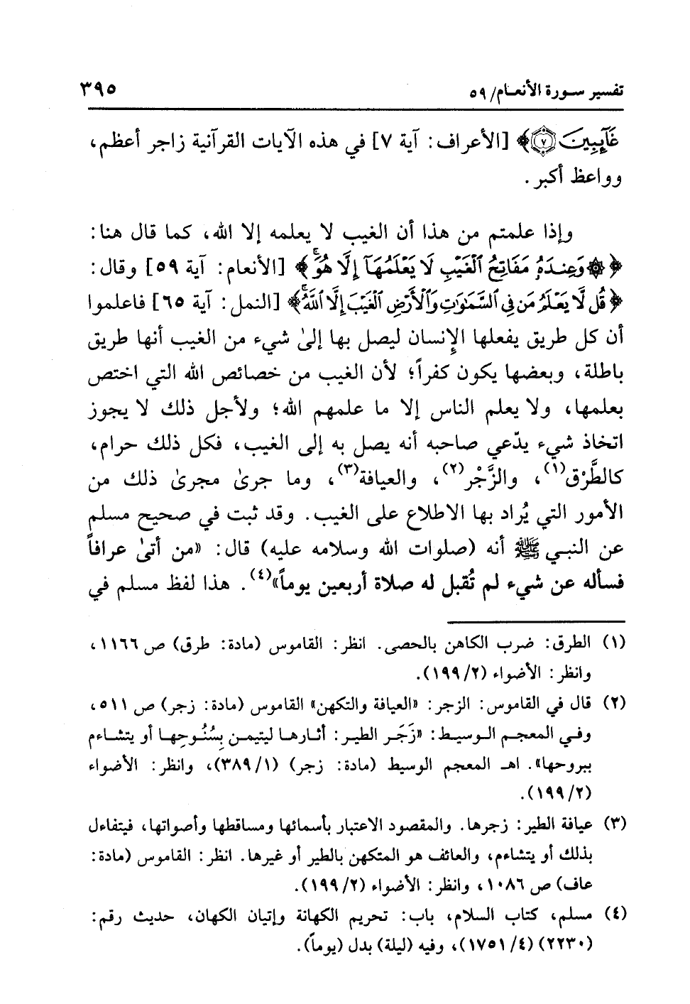 وإذا عَلِمْتُمْ من هذا أن الغيبَ لا يَعْلَمُهُ إِلاَّ اللَّهُ، كما قال هنا: {وَعِندَهُ مَفَاتِحُ الْغَيْبِ لاَ يَعْلَمُهَا إِلاَّ هُوَ} [الأنعام: آية 59] وقال: {قُل لاَّ يَعْلَمُ مَنْ فِي السَّمَاوَاتِ وَالْأَرْضِ الْغَيْبَ إِلاَّ اللَّهُ} [النمل: آية 65] فَاعْلَمُوا أن كُلَّ طريقٍ يفعلُها الإنسانُ ليصلَ بها إلى شيءٍ من الغيبِ أنها طريقٌ باطلةٌ، وبعضُها يكونُ كُفْرًا؛ لأن الغيبَ من خصائصِ اللَّهِ التي اخْتَصَّ بِعِلْمِهَا، ولا يعلمُ الناسُ إلا ما عَلَّمَهُمُ اللَّهُ؛ ولأَجْلِ ذلك لا يجوزُ اتخاذُ شيءٍ يَدَّعِي صاحبُه أنه يصلُ به إلى الغيبِ، فَكُلُّ ذلك حرامٌ، كالطَّرْقِ (¬1)، والزَّجْرِ (¬2)، والعِيَافَةِ (¬3)، وما جَرَى مَجْرَى ذلك من الأمورِ التي يُرَادُ بها الاطلاعُ على الغيبِ. وقد ثَبَتَ في صحيحِ مسلمٍ عن النبيِّ - صلى الله عليه وسلم - أنه (صلواتُ اللَّهِ وسلامُه عليه) قال: «مَنْ أَتَى عَرَّافًا فَسَأَلَهُ عَنْ شَيْءٍ لَمْ تُقْبَلْ لَهُ صَلاَةٌ أَرْبَعِينَ يَوْمًا» (¬4). هذا لفظُ مسلمٍ في
