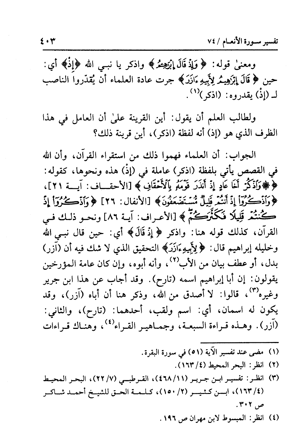 الجوابُ: أن العلماءَ فَهِمُوا ذلك مِنَ استقراءِ القرآنِ، وأن اللَّهَ فِي القصصِ يأتِي بلفظةِ (اذْكُرْ) عاملةً فِي (إذْ) هذه ونحوِها، كقولِه: {وَاذْكُرْ أَخَا عَادٍ إِذْ أَنْذَرَ قَوْمَهُ بِالْأَحْقَافِ} [الأحقاف: آية 21] {وَاذْكُرُوا إِذْ أَنْتُمْ قَلِيلٌ مُّسْتَضْعَفُونَ} [الأنفال: 26] {وَاذْكُرُوا إِذْ كُنْتُمْ قَلِيلاً فَكَثَّرَكُمْ} [الأعراف: آية 86] ونحو ذلك في القرآنِ، كذلك قولُه هنا: وَاذْكُرْ {إِذْ قَالَ} أي: حينَ قال نَبِيُّ اللَّهِ وخليلُه إبراهيمُ قال: {لأَبِيهِ آزَرَ} التحقيقُ الذي لاَ شَكَّ فيه أن (آزَرَ) بَدَلٌ، أو عطفُ بيانٍ من الأبِ (¬2)، وأنه أَبُوهُ، وإن كان عامةُ المؤرخينَ يقولونَ: إن أَبَا إبراهيمَ اسمُه (تارح). وقد أجابَ عن هذا ابنُ جريرٍ وغيرُه (¬3)، قالوا: لاَ أصدقَ من اللَّهِ، وَذَكَرَ هنا أن أَبَاهُ (آزَرَ)، وقد يكونُ له اسمانِ، أي: اسمٌ ولقبٌ، أحدُهما: (تارح)، والثاني: (آزر). وهذه قراءةُ السبعةِ، وجماهير القراء (¬4)،