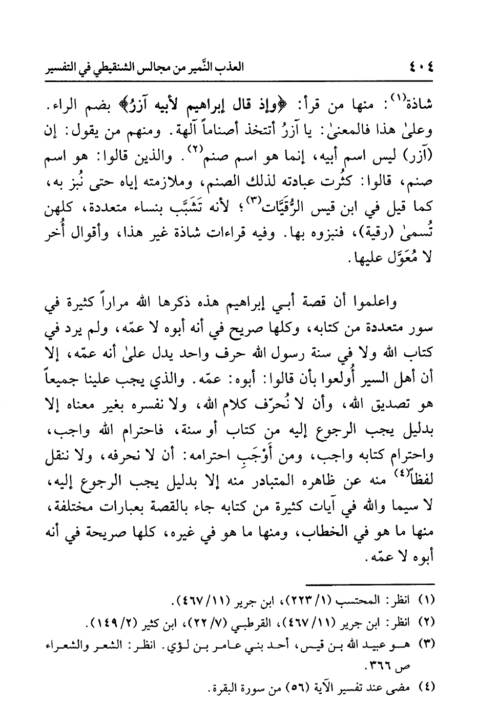 وَاعْلَمُوا أن قصةَ أَبِي إبراهيمَ هذه ذَكَرَهَا اللَّهُ مِرَارًا كثيرةً في سورٍ متعددةٍ من كتابِه، وَكُلُّهَا صريحٌ في أنه أَبُوهُ لاَ عمَّه، ولم يَرِدْ في كتابِ اللَّهِ ولا في سنةِ رسولِ اللَّهِ حرفٌ واحدٌ يدلُّ على أنه عمُّه، إلا أن أهلَ السِّيَرِ أُولِعُوا بأن قالوا: أَبُوهُ: عمُّه. والذي يَجِبُ علينا جميعًا هو تصديقُ اللَّهِ، وأن لاَ نُحَرِّفَ كلامَ اللَّهِ، ولا نفسرَه بغيرِ معناه إلا بدليلٍ يجبُ الرجوعُ إليه مِنْ كتابٍ أو سُنَّةٍ، فاحترامُ اللَّهِ واجبٌ، واحترامُ كتابِه واجبٌ، وَمَنْ أَوْجَبِ احترامِه: أَنْ لاَ نُحَرِّفَهُ، ولا ننقلَ لَفْظًا (¬4) منه عن ظاهرِه الْمُتَبَادَرِ منه إلا بدليلٍ يجبُ الرجوعُ إليه، لاَ سيما وَاللَّهُ في آياتٍ كثيرةٍ من كتابِه جَاءَ بالقصةِ بعباراتٍ مختلفةٍ، منها ما هو في الخطابِ، ومنها ما هو في غيرِه، كُلُّهَا صريحةٌ فِي أنه أَبُوهُ لاَ عمَّه.