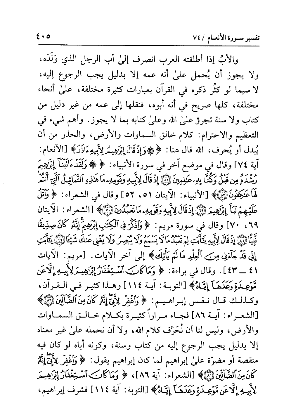 والأبُ إِذَا أَطْلَقَتْهُ العربُ انْصَرَفَ إلى أَبِ الرجلِ الذي وَلَدَهُ، ولا يجوزُ أن يُحْمَلَ على أنه عَمُّهُ إلا بدليلٍ يجبُ الرجوعُ إليه، لا سيما لو كَثُرَ ذِكْرُهُ في القرآنِ بعباراتٍ كثيرةٍ مختلفةٍ، على أنحاءَ مختلفةٍ، كُلُّهَا صريحٌ في أنه أَبُوهُ، فَنَقَلَهَا إلى عَمِّهِ من غيرِ دليلٍ من كتابٍ وَلاَ سُنَّةٍ تَجَرُّؤٌ على اللَّهِ وعلى كتابِه بما لا يجوزُ. وَأَهَمُّ شيءٍ في التعظيمِ والاحترامِ: كلامُ خالقِ السماواتِ والأرضِ، والحذرُ مِنْ أَنْ يُبَدَّلَ أو يُحَرَّفَ، اللَّهُ قال هنا: {وَإِذْ قَالَ إِبْرَاهِيمُ لأَبِيهِ آزَرَ} [الأنعام: آية 74] وقال في مَوْضِعٍ آخَرَ في سورةِ الأنبياءِ: {وَلَقَدْ آتَيْنَا إِبْرَاهِيمَ رُشْدَهُ مِنْ قَبْلُ وَكُنَّا بِهِ عَالِمِينَ (51) إِذْ قَالَ لأَبِيهِ وَقَوْمِهِ مَا هَذِهِ التَّمَاثِيلُ الَّتِي أَنْتُمْ لَهَا عَاكِفُونَ (52)} [الأنبياء: الآيتان 51، 52] وقال في الشعراءِ: {وَاتْلُ عَلَيْهِمْ نَبَأَ إِبْرَاهِيمَ (69) إِذْ قَالَ لأَبِيهِ وَقَوْمِهِ مَا تَعْبُدُونَ (70)} [الشعراء: الآيتانِ 69، 70] وقال في سورةِ مريمَ: {وَاذْكُرْ فِي الْكِتَابِ إِبْرَاهِيمَ إِنَّهُ كَانَ صِدِّيقًا نَبِيًّا (41) إِذْ قَالَ لأَبِيهِ يَا أَبَتِ لِمَ تَعْبُدُ مَا لاَ يَسْمَعُ وَلاَ يُبْصِرُ وَلاَ يُغْنِي عَنْكَ شَيْئًا (42) يَا أَبَتِ إِنِّي قَدْ جَاءَنِي مِنَ الْعِلْمِ مَا لَمْ يَأْتِكَ} إلى آخِرِ الآياتِ. [مريم: الآيات 41 - 43].