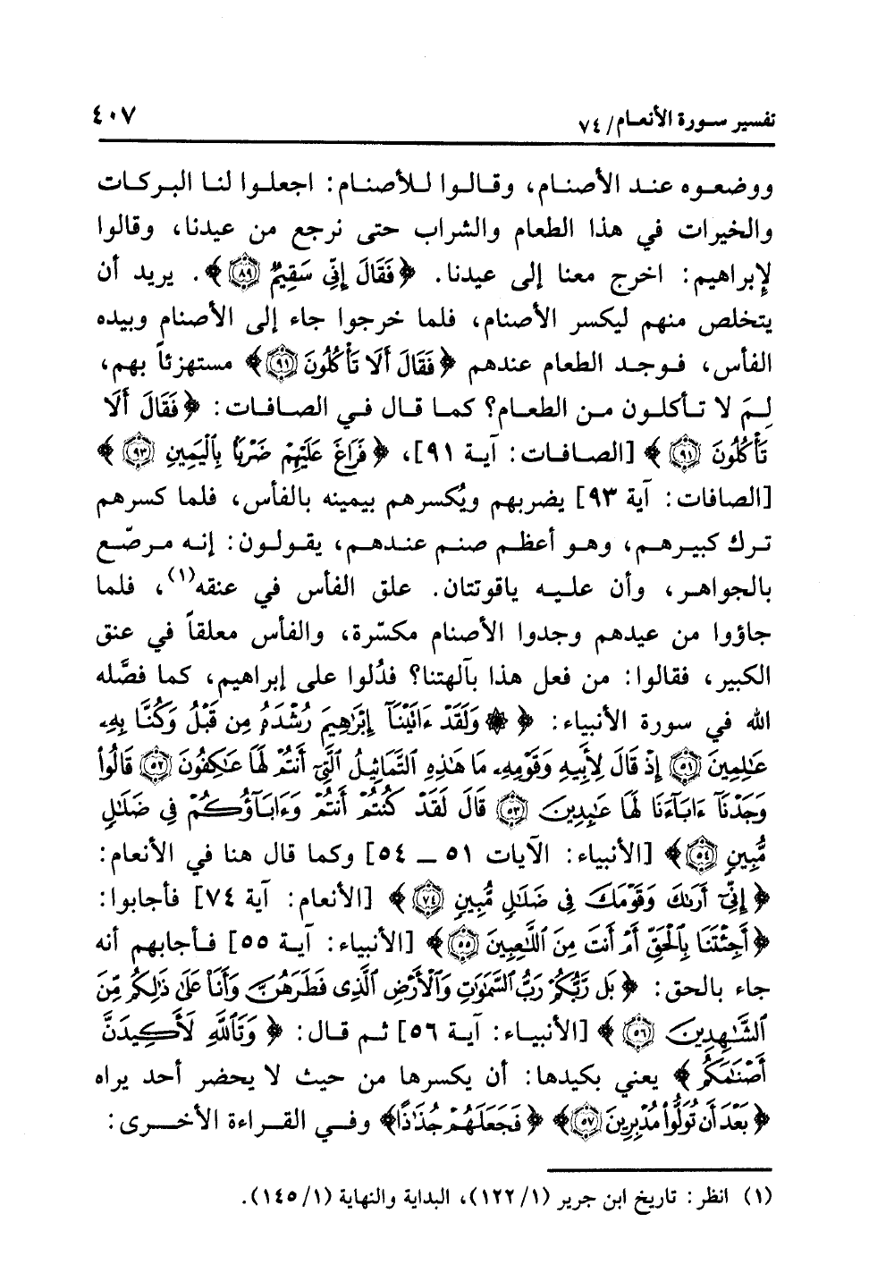 فلما جَاؤُوا من عيدِهم وَجَدُوا الأصنامَ مُكَسَّرَةً، والفأسَ مُعَلَّقًا في عُنُقِ الكبيرِ، فقالوا: مَنْ فَعَلَ هذا بِآلِهَتِنَا؟ فَدُلُّوا على إبراهيمَ، كما فَصَّلَهُ اللَّهُ في سورةِ الأنبياءِ: {وَلَقَدْ آتَيْنَا إِبْرَاهِيمَ رُشْدَهُ مِنْ قَبْلُ وَكُنَّا بِهِ عَالِمِينَ (51) إِذْ قَالَ لأَبِيهِ وَقَوْمِهِ مَا هَذِهِ التَّمَاثِيلُ الَّتِي أَنْتُمْ لَهَا عَاكِفُونَ (52) قَالُوا وَجَدْنَا آبَاءَنَا لَهَا عَابِدِينَ (53) قَالَ لَقَدْ كُنْتُمْ أَنْتُمْ وَآبَاؤُكُمْ فِي ضَلاَلٍ مُبِينٍ (54)} [الأنبياء: الآيات 51 - 54] وكما قال هنا في الأنعامِ: {إِنِّي أَرَاكَ وَقَوْمَكَ فِي ضَلاَلٍ مُّبِينٍ} [الأنعام: آية 74] فَأَجَابُوا: {أَجِئْتَنَا بِالْحَقِّ أَمْ أَنْتَ مِنَ اللاَّعِبِينَ} [الأنبياء: آية 55] فَأَجَابَهُمْ أنه جَاءَ بالحقِّ: {بَل رَّبُّكُمْ رَبُّ السَّمَاوَاتِ وَالْأَرْضِ الَّذِي فَطَرَهُنَّ وَأَنَا عَلَى ذَلِكُم مِّنَ الشَّاهِدِينَ} [الأنبياء: آية 56] ثم قَالَ: {وَتَاللَّهِ لَأَكِيدَنَّ أَصْنَامَكُم} يعني بِكَيْدِهَا: أن يكسرَها من حيثُ لا يحضر أحدٌ يَرَاهُ {بَعْدَ أَن تُوَلُّوا مُدْبِرِينَ} {فَجَعَلَهُمْ جُذَاذًا} وفي القراءةِ الأُخْرَى: