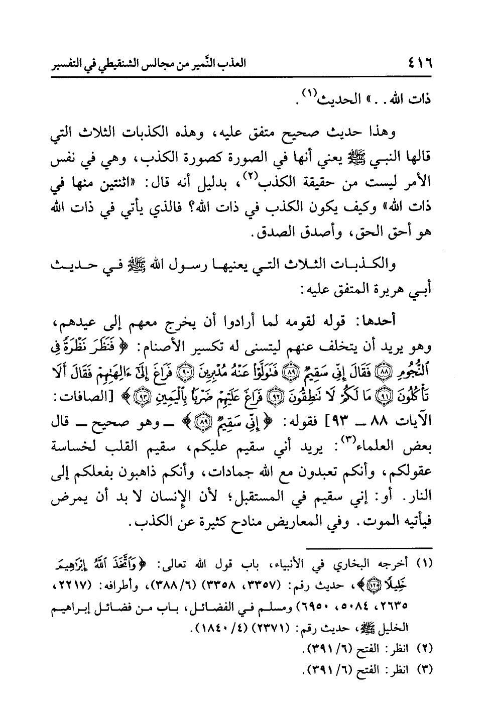وهذا حديثٌ صحيحٌ متفقٌ عليه، وهذه الكذباتُ الثلاثُ التي قالها النبيُّ - صلى الله عليه وسلم - يعني أنها في الصورةِ كصورةِ الكذبِ، وهي في نفسِ الأمرِ لَيْسَتْ من حقيقةِ الكذبِ (¬2)، بدليلِ أنه قال: «اثْنَتَيْنِ مِنْهَا فِي ذَاتِ اللَّهِ» وكيفَ يكونُ الكذبُ في ذاتِ اللَّهِ؟ فالذي يأتِي في ذاتِ اللَّهِ هو أَحَقُّ الْحَقِّ، وأصدقُ الصدقِ.