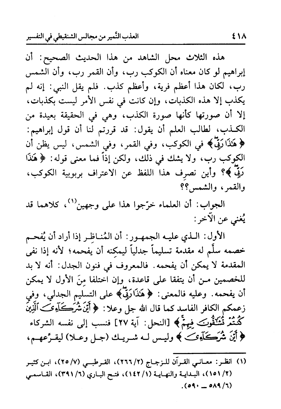 الأولُ: الذي عليه الجمهورُ: أن الْمُنَاظِرَ إذا أرادَ أن يُفْحِمَ خَصْمَهُ سلَّم له مقدمةً تسليمًا جَدَلِيًّا لِيُمْكِنَهُ أن يَفْحَمَهُ؛ لأنه إذا نَفَى المقدمةَ لا يُمْكِنُ أن يفحمَه. فالمعروفُ في فنونِ الجدلِ: أنه لا بُدَّ للخصمين من أن يَتَّفِقَا على قاعدةٍ، وإن اختلفا مِنَ الأول لا يمكن أن يفحمه. وعليه فالمعنَى: {هَذَا رَبِّي} على التسليمِ الْجَدَلِيِّ، وفي زَعْمِكُمُ الكافرِ الفاسدِ كما قال اللَّهُ جل وعلا: {أَيْنَ شُرَكَائِيَ الَّذِينَ كُنْتُمْ تُشَاقُّونَ فِيهِمْ} [النحل: آية 27] فَنَسَبَ إلى نفسِه الشركاءَ {أَيْنَ شُرَكَائِيَ} وليس له شريكٌ (جل وعلا) لِيُقَرِّعَهُمْ،