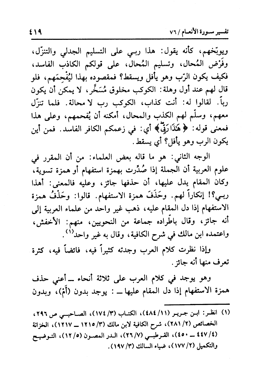 الوجهُ الثاني: هو ما قَالَهُ بعضُ العلماءِ: مِنْ أن المقررَ في علومِ العربيةِ أن الجملةَ إذا صُدِّرَتْ بهمزةِ استفهامٍ أو همزةِ تسويةٍ، وكان المقامُ يَدُلُّ عليها، أن حذفَها جائزٌ، وعليه فالمعنَى: أَهَذَا رَبِّي؟! إنكارًا لهم. وحَذَفَ همزةَ الاستفهامِ. قالوا: وحَذْفُ همزةِ الاستفهامِ إذا دَلَّ المقامُ عليه ذَهَبَ غيرُ واحدٍ من علماءِ العربيةِ إلى أنه جائزٌ، وقال بِاطِّرَادِهِ جماعةٌ من النحويين، منهم: الأخفشُ، واعتمدَه ابنُ مالكٍ في شرحِ الكافيةِ، وقال به غيرُ وَاحِدٍ (¬1).