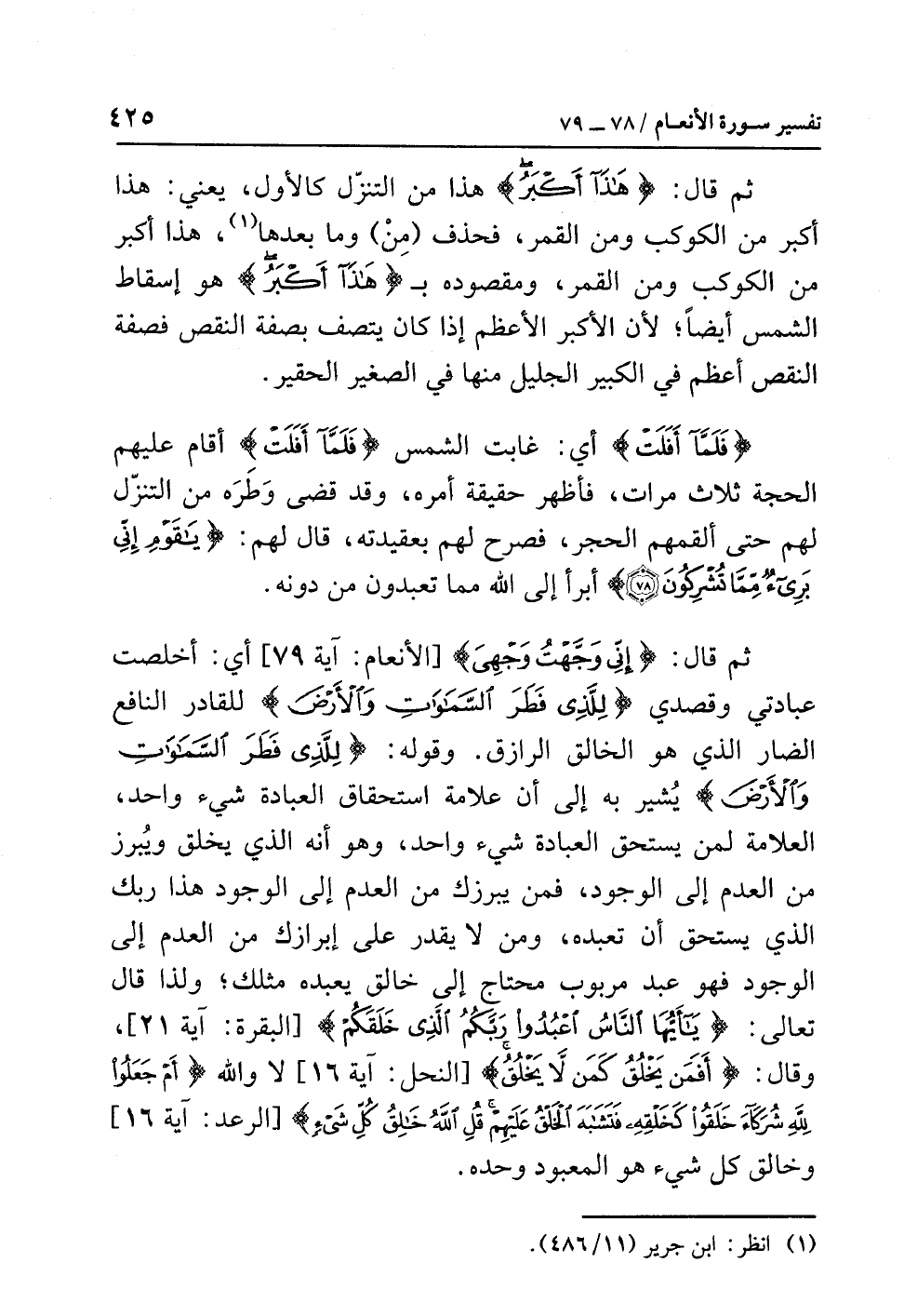 ثم قال: {إِنِّي وَجَّهْتُ وَجْهِيَ} [الأنعام: آية 79] أي: أَخْلَصْتُ عِبَادَتِي وَقَصْدِي {لِلَّذِي فَطَرَ السَّمَاوَاتِ وَالأَرْضَ} للقادرِ النافعِ الضارِّ الذي هو الخالقُ الرازقُ. وقولُه: {لِلَّذِي فَطَرَ السَّمَاوَاتِ وَالأَرْضَ} يُشِيرُ به إلى أن علامةَ استحقاقِ العبادةِ شيءٌ واحدٌ، العلامةُ لِمَنْ يستحقُّ العبادةَ شيءٌ واحدٌ، وهو أنه الذي يَخْلُقُ وَيُبْرِزُ من العدمِ إلى الوجودِ، فَمَنْ يُبْرِزُكَ من العدمِ إلى الوجودِ هذا رَبُّكَ الذي يستحقُّ أن تعبدَه، وَمَنْ لاَ يَقْدِرُ على إبرازِك من العدمِ إلى الوجودِ فهو عبدٌ مربوبٌ محتاجٌ إلى خالقٍ يعبدُه مثلُك؛ وَلِذَا قال تعالى: {يَا أَيُّهَا النَّاسُ اعْبُدُوا رَبَّكُمُ الَّذِي خَلَقَكُمْ} [البقرة: آية 21] وقال: {أَفَمَنْ يَخْلُقُ كَمَن لاَّ يَخْلُقُ} [النحل: آية 16] لا وَاللَّهِ {أَمْ جَعَلُوا لِلَّهِ شُرَكَاءَ خَلَقُوا كَخَلْقِهِ فَتَشَابَهَ الْخَلْقُ عَلَيْهِمْ قُلِ اللَّهُ خَالِقُ كُلِّ شَيْءٍ} [الرعد: آية 16] وخالقُ كُلِّ شيءٍ هو المعبودُ وحدَه.