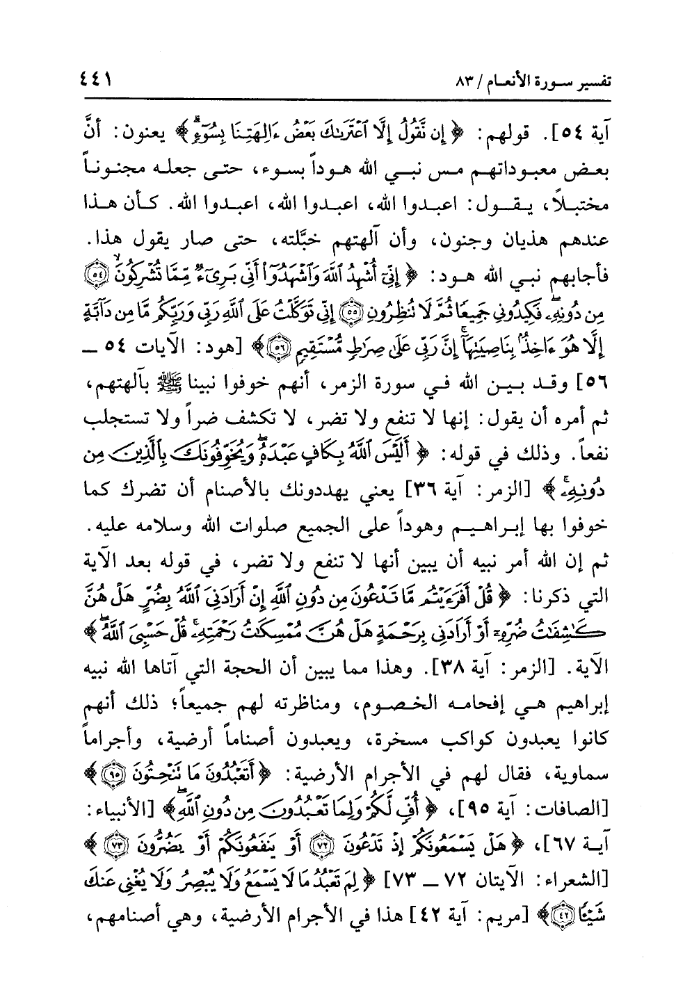 ثُمَّ إن اللَّهَ أمرَ نَبِيَّهُ أن يبينَ أنها لا تنفعُ ولا تضرُّ، في قولِه بعدَ الآيةِ التي ذَكَرْنَا: {قُلْ أَفَرَأَيْتُم مَّا تَدْعُونَ مِنْ دُونِ اللَّهِ إِنْ أَرَادَنِيَ اللَّهُ بِضُرٍّ هَلْ هُنَّ كَاشِفَاتُ ضُرِّهِ أَوْ أَرَادَنِي بِرَحْمَةٍ هَلْ هُنَّ مُمْسِكَاتُ رَحْمَتِهِ قُلْ حَسْبِيَ اللَّهُ} الآية. [الزمر: آية 38]. وهذا مِمَّا يبين أن الحجةَ التي آتَاهَا اللَّهُ نَبِيَّهُ إبراهيمَ هي إفحامُه الخصومَ، ومناظرتُه لهم جميعًا؛ ذلك أنهم كانوا يعبدونَ كواكبَ مسخرةً، ويعبدونَ أصنامًا أرضيةً، وأجرامًا سماويةً، فقال لهم في الأجرامِ الأرضيةِ: {أَتَعْبُدُونَ مَا تَنْحِتُونَ} [الصافات: آية 95] {أُفٍّ لَّكُمْ وَلِمَا تَعْبُدُونَ مِنْ دُونِ اللَّهِ} [الأنبياء: آية 67] {هَلْ يَسْمَعُونَكُمْ إِذْ تَدْعُونَ أَوْ يَنْفَعُونَكُمْ أَوْ يَضُرُّونَ} [الشعراء: الآيتان 72 - 73] {لِمَ تَعْبُدُ مَا لاَ يَسْمَعُ وَلاَ يُبْصِرُ وَلاَ يُغْنِي عَنْكَ شَيْئًا} [مريم: آية 42] هذا في الأجرامِ الأرضيةِ، وهي أصنامُهم،