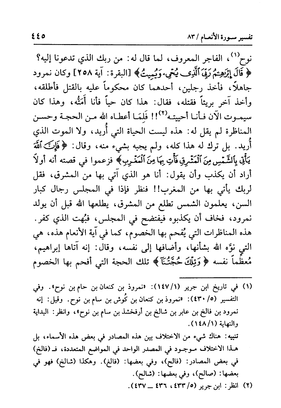 الفاجرُ المعروفُ، لَمَّا قال له: مَنْ رَبُّكَ الذي تَدْعُونَا إليه؟ {قَالَ إِبْرَاهِيمُ رَبِّيَ الَّذِي يُحْيِي وَيُمِيتُ} [البقرة: آية 258] وكان نمرودُ جاهلاً، فَأَخَذَ رَجُلَيْنِ، أحدُهما كان محكومًا عليه بالقتلِ فأطلقَه، وأخذ آخَرَ بريئًا فَقَتَلَهُ، فقال: هذا كان حَيًّا فأنا أَمَتُّهُ، وهذا كان سيموتُ الآنَ فأنا أَحْيَيْتُهُ (¬2)!! فَلِمَا أَعْطَاهُ اللَّهُ من الحجةِ وحسنِ المناظرةِ لم يَقُلْ له: هذه ليست الحياةَ التي أُرِيدُ، ولا الموتَ الذي أُرِيدُ. بل تَرَكَ له هذا كُلَّهُ، ولم يُجِبْهُ بشيءٍ منه، وقال: {فَإِنَّ اللَّهَ يَأْتِي بِالشَّمْسِ مِنَ الْمَشْرِقِ فَأْتِ بِهَا مِنَ الْمَغْرِبِ} فَزَعَمُوا في قصتِه أنه أَوَّلاً أرادَ أن يكذبَ وأن يقولَ: أنا هو الذي آتِي بها من المشرقِ، فَقُلْ لِرَبِّكَ يأتِي بها من المغربِ!! فَنَظَرَ فإذا في المجلسِ رجالٌ كبارُ السِّنِّ، يعلمونَ الشمسَ تطلعُ من المشرقِ، يُطْلِعُهَا اللَّهُ قبلَ أن يولدَ نمرود، فَخَافَ أن يُكَذِّبُوهُ فيفتضحُ في المجلسِ، فَبُهِتَ الذي كَفَرَ. هذه المناظراتُ التي يُفْحَمُ بها الخصومُ، كما في آيةِ الأنعامِ هذه، هي التي نَوَّهَ اللَّهُ بشأنِها، وأضافَها إلى نفسِه، وقال: إنه آتَاهَا إبراهيمَ، مُعَظِّمًا نفسَه: {وَتِلْكَ حُجَّتُنَا} تلك الحجةُ التي أَفْحَمَ بها الخصومَ