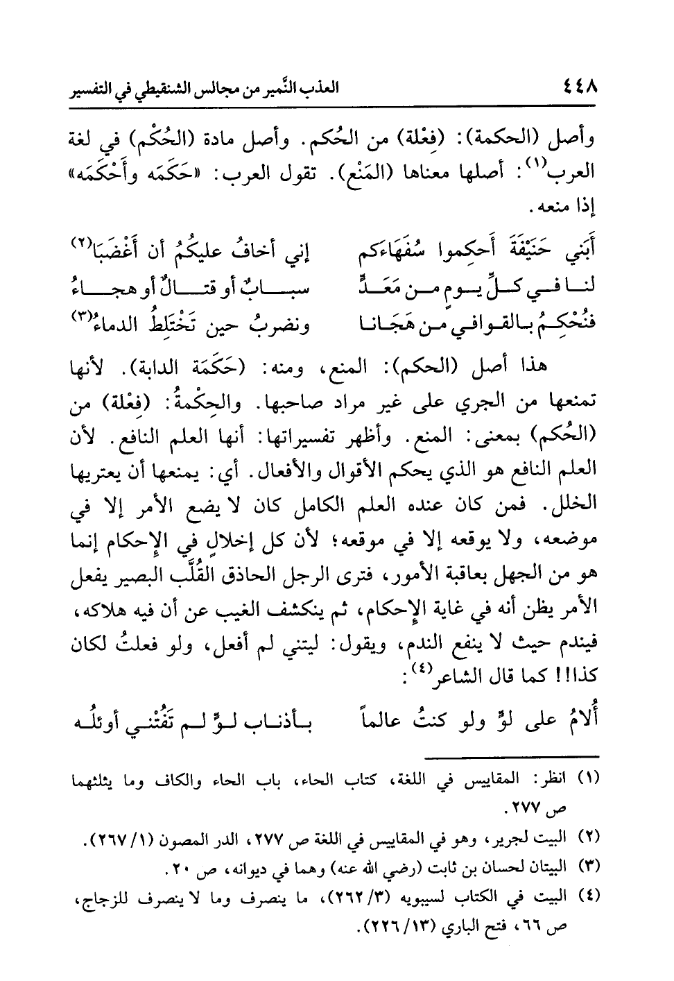 هذا أصلُ (الحكمِ): المنعُ، وَمِنْهُ: (حَكَمَةُ الدَّابَّةِ). لأنها تمنعُها من الجريِ على غيرِ مرادِ صاحبِها. والحِكْمةُ: (فِعْلة) من (الحُكم) بمعنَى: المنعِ. وأظهرُ تفسيراتِها: أنها العلمُ النافعُ؛ لأن العلمَ النافعَ هو الذي يَحْكُمُ الأقوالَ والأفعالَ. أي: يمنعُها أن يعتريَها الخللُ. فَمَنْ كان عندَه العلمُ الكاملُ كان لا يضعُ الأمرَ إلا في موضعِه، ولا يوقعُه إلا في موقعِه؛ لأن كُلَّ إخلالٍ في الإحكامِ إنما هو من الجهلِ بعاقبةِ الأمورِ، فَتَرَى الرجلَ الحاذقَ القُلَّبَ البصيرَ يفعلُ الأمرَ يظنُّ أنه في غايةِ الإحكامِ، ثم ينكشفُ الغيبُ عن أن فيه هلاكَه، فيندمُ حيث لا ينفعُ الندمُ، ويقولُ: ليتني لَمْ أَفْعَلْ، ولو فَعَلْتُ لكانَ كَذَا!! كما قال الشاعرُ (¬4):