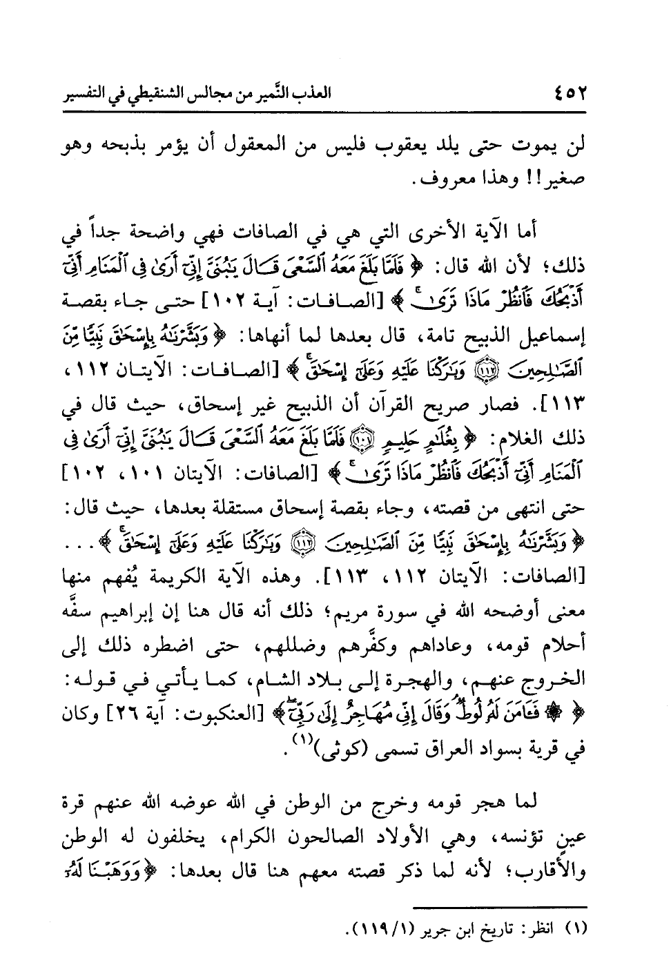 أما الآيةُ الأُخْرَى التي هِيَ في الصافاتِ فهي واضحةٌ جِدًّا في ذلك؛ لأَنَّ اللَّهَ قال: {فَلَمَّا بَلَغَ مَعَهُ السَّعْيَ قَالَ يَا بُنَيَّ إِنِّي أَرَى فِي الْمَنَامِ أَنِّي أَذْبَحُكَ فَانْظُرْ مَاذَا تَرَى} [الصافات: آية 102] حتى جَاءَ بقصةِ إسماعيلَ الذبيحِ تَامَّةً، قال بَعْدَهَا لَمَّا أَنْهَاهَا: {وَبَشَّرْنَاهُ بِإِسْحَاقَ نَبِيًّا مِنَ الصَّالِحِينَ (112) وَبَارَكْنَا عَلَيْهِ وَعَلَى إِسْحَاقَ (113)} [الصافات: الآيتان 112، 113]. فَصَارَ صريحُ القرآنِ أَنَّ الذبيحَ غيرُ إسحاقَ، حيثُ قَالَ في ذلك الغلامِ: {بِغُلاَمٍ حَلِيمٍ (101) فَلَمَّا بَلَغَ مَعَهُ السَّعْيَ قَالَ يَا بُنَيَّ إِنِّي أَرَى فِي الْمَنَامِ أَنِّي أَذْبَحُكَ فَانْظُرْ مَاذَا تَرَى} [الصافات: الآيتان 101، 102] حَتَّى انْتَهَى من قصتِه، وَجَاءَ بقصةِ إسحاقَ مستقلةً بَعْدَهَا، حيثُ قال: {وَبَشَّرْنَاهُ بِإِسْحَاقَ نَبِيًّا مِنَ الصَّالِحِينَ (112) وَبَارَكْنَا عَلَيْهِ وَعَلَى إِسْحَاقَ} ... [الصافات: الآيتان 112، 113]. وهذه الآيةُ الكريمةُ يُفْهَمُ منها معنًى أَوْضَحَهُ اللَّهُ في سورةِ مريمَ؛ ذلك أنه قال هنا إِنَّ إبراهيمَ سَفَّهَ أَحْلاَمَ قومِه، وَعَادَاهُمْ وَكَفَّرَهُمْ وَضَلَّلَهُمْ، حتى اضطره ذلك إلى الخروجِ عنهم، والهجرةِ إلى بلادِ الشامِ، كما يأتِي في قولِه: {فَآمَنَ لَهُ لُوطٌ وَقَالَ إِنِّي مُهَاجِرٌ إِلَى رَبِّي} [العنكبوت: آية 26] وَكَانَ فِي قريةٍ بسوادِ العراقِ تُسَمَّى (كوثى) (¬1).