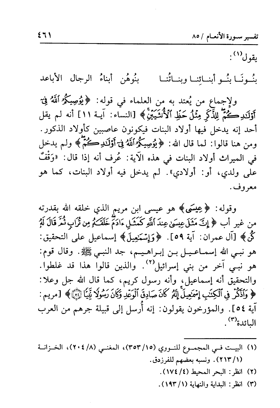 ولإجماعِ مَنْ يُعْتَدُّ بِهِ من العلماءِ في قولِه: {يُوصِيكُمُ اللَّهُ فِي أَوْلاَدِكُمْ لِلذَّكَرِ مِثْلُ حَظِّ الأُنْثَيَيْنِ} [النساء: آية 11] أنه لم يَقُلْ أحدٌ إنه يدخلُ فيها أولادُ البناتِ فيكونونَ عَاصِبِينَ كأولادِ الذكورِ. ومن هنا قالوا: لَمَّا قال اللَّهُ: {يُوصِيكُمُ اللَّهُ فِي أَوْلاَدِكُمْ} ولم يَدْخُلْ في الميراثِ أولادُ البناتِ في هذه الآيةِ: عُرِفَ أنه إذا قال: «وَقْفٌ عَلَى وَلَدِي، أو: أَوْلاَدِي». لَمْ يَدْخُلْ فيه أولادُ البناتِ، كما هو معروفٌ.