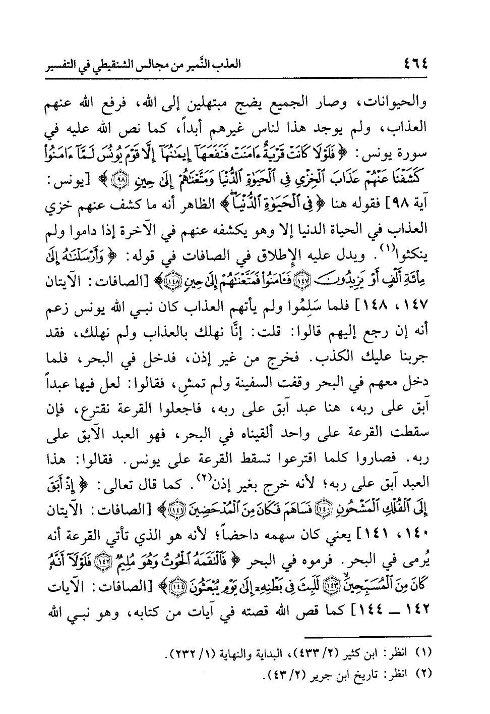 والحيواناتِ، وصارَ الجميعُ يَضِجُّ مبتهلين إلى اللَّهِ، فَرَفَعَ اللَّهُ عنهم العذابَ، ولم يُوجَدْ هذا لناسٍ غيرِهم أبدًا، كما نَصَّ اللَّهُ عليه في سورةِ يونسَ: {فَلَوْلاَ كَانَتْ قَرْيَةٌ آمَنَتْ فَنَفَعَهَا إِيمَانُهَا إِلاَّ قَوْمَ يُونُسَ لَمَّا آمَنُوا كَشَفْنَا عَنْهُمْ عَذَابَ الْخِزْيِ فِي الْحَيَاةَ الدُّنْيَا وَمَتَّعْنَاهُمْ إِلَى حِينٍ} [يونس: آية 98] فقولُه هُنَا: {فِي الْحَيَاةِ الدُّنْيَا} الظاهرُ أنه ما كَشَفَ عنهم خزيَ العذابِ في الحياةِ الدنيا إلا وهو يكشفُه عنهم في الآخرةِ إِذَا دَامُوا وَلَمْ يَنْكُثُوا (¬1). ويدلُّ عليه الإطلاقُ في الصافاتِ في قولِه: {وَأَرْسَلْنَاهُ إِلَى مِائَةِ أَلْفٍ أَوْ يَزِيدُونَ (147) فَآمَنُوا فَمَتَّعْنَاهُمْ إِلَى حِينٍ (148)} [الصافات: الآيتان 147، 148] فَلَمَّا سَلِمُوا وَلَمْ يأتِهم العذابُ كان نَبِيُّ اللَّهِ يونسُ زَعَمَ أنه إن رَجَعَ إليهم قالوا: قُلْتَ: إِنَّا نُهْلَكُ بالعذابِ وَلَمْ نُهْلَكْ، فقد جَرَّبْنَا عليكَ الكذبَ. فَخَرَجَ مِنْ غَيْرِ إِذْنٍ، فدخلَ في البحرِ، فَلَمَّا دَخَلَ مَعَهُمْ فِي البحرِ وَقَفَتِ السفينةُ ولم تَمْشِ، فقالوا: لَعَلَّ فيها عَبْدًا آبق على رَبِّهِ، هنا عَبْدٌ آبِقُ عَلَى رَبِّهِ، فَاجْعَلُوا القرعةَ نَقْتَرِعْ، فَإِنْ سَقَطَتِ الْقُرْعَةُ على واحدٍ أَلْقَيْنَاهُ فِي الْبَحْرِ، فهو العبدُ الآبِقُ عَلَى رَبِّهِ. فَصَارُوا كُلَّمَا اقْتَرَعُوا تسقط القرعةُ على يونسَ.