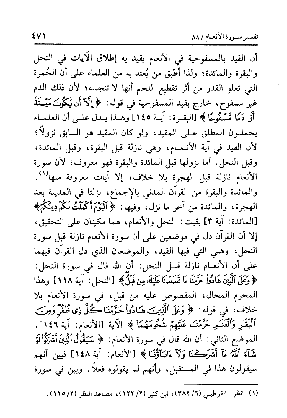 والمائدةُ والبقرةُ من القرآنِ الْمَدَنِيٍّ بالإجماعِ، نَزَلَتَا في المدينةِ بعدَ الهجرةِ، والمائدةُ مِنْ آخِرِ ما نَزَلَ، وفيها: {الْيَوْمَ أَكْمَلْتُ لَكُمْ دِينَكُمْ} [المائدة: آية 3] بَقِيَتِ: النحلُ والأنعامُ، هما مكيتان على التحقيقِ، إلا أن القرآنَ دَلَّ في مَوْضِعَيْنِ على أن سورةَ الأنعامِ نازلةٌ قبلَ سورةِ النحلِ، وهي التي فيها القيدُ، والموضعانِ الذي دَلَّ القرآنُ فيهما على أن الأنعامَ نازلةٌ قبلَ النحلِ: أن اللَّهَ قال في سورةِ النحلِ: {وَعَلَى الَّذِينَ هَادُوا حَرَّمْنَا مَا قَصَصْنَا عَلَيْكَ مِنْ قَبْلُ} [النحل: آية 118] وهذا الْمُحَرَّمُ المحالُ، الْمَقْصُوصُ عليه من قبلُ، في سورةِ الأنعامِ بِلاَ خِلاَفٍ في قولِه: {وَعَلَى الَّذِينَ هَادُوا حَرَّمْنَا كُلَّ ذِي ظُفُرٍ وَمِنَ الْبَقَرِ وَالْغَنَمِ حَرَّمْنَا عَلَيْهِمْ شُحُومَهُمَا} الآيةَ [الأنعام: آية 146].