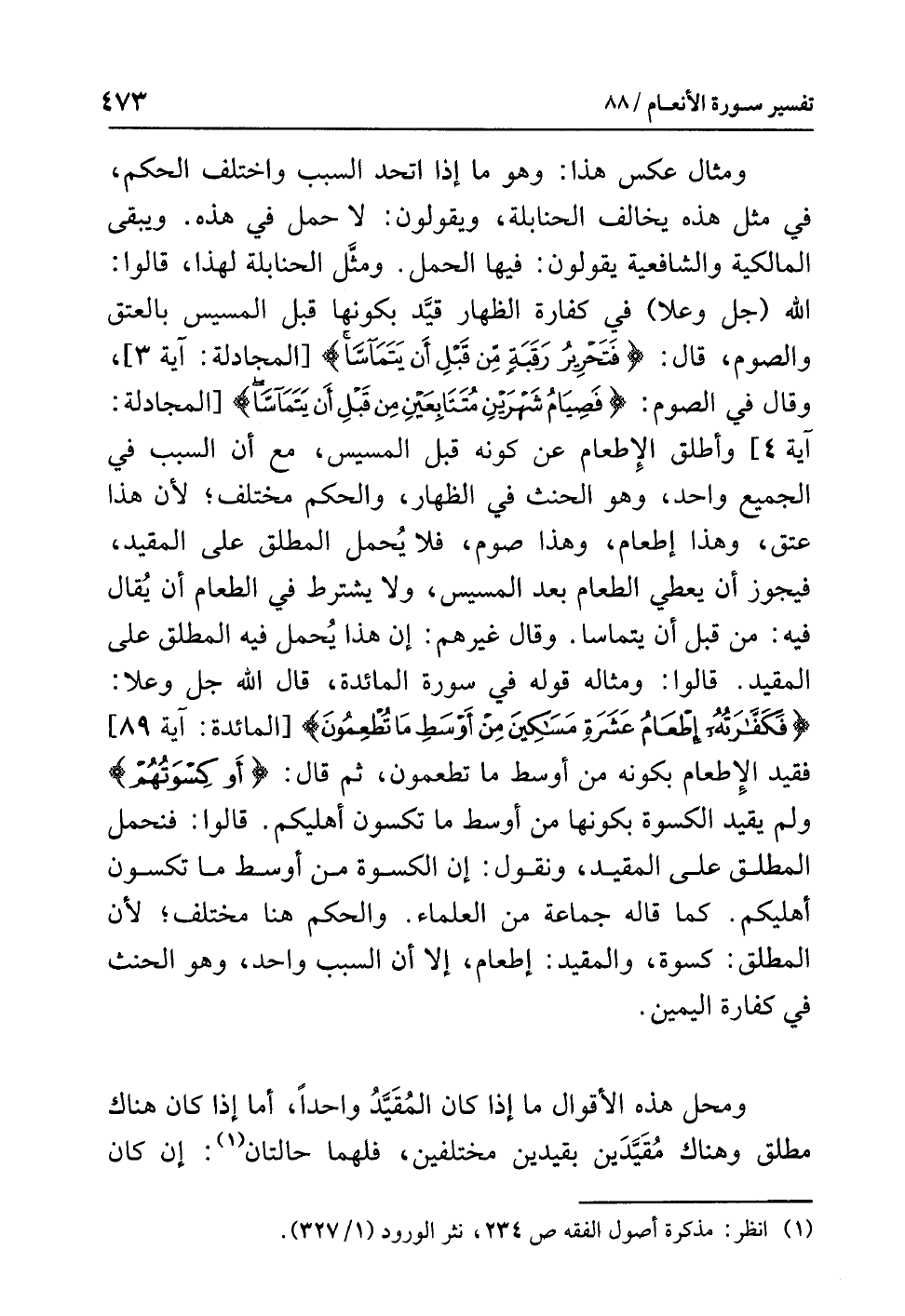 ومثالُ عكسِ هذا: وهو ما إذا اتَّحَدَ السببُ واختلفَ الحكمُ، في مِثْلِ هذه يخالفُ الحنابلةَ ويقولونَ: لاَ حَمْلَ في هذه. وَيَبْقَى المالكيةُ والشافعيةُ يقولونَ: فيها الْحَمْلُ. وَمَثَّلَ الحنابلةُ لهذا قالوا: اللَّهُ (جَلَّ وَعَلاَ) في كفارةِ الظهارِ قَيَّدَ بِكَوْنِهَا قبلَ المسيسِ بالعتقِ والصومِ، قال: {فَتَحْرِيرُ رَقَبَةٍ مِّنْ قَبْلِ أَنْ يَتَمَاسَّا} [المجادلة: آية 3] وقال في الصومِ: {فَصِيَامُ شَهْرَيْنِ مُتَتَابِعَيْنِ مِنْ قَبْلِ أَنْ يَتَمَاسَّا} [المجادلة: آية 4] وَأَطْلَقَ الإطعامَ عن كونِه قبلَ المسيسِ، معَ أن السببَ في الجميعِ واحدٌ، وهو الحنثُ في الظهارِ، والحكمُ مختلفٌ؛ لأن هذا عِتْقٌ، وهذا إطعامٌ، وهذا صومٌ، فَلاَ يُحْمَلُ المطلقُ على المقيدِ، فيجوزُ أن يُعْطِيَ الطعامَ بعدَ المسيسِ، ولا يشترطُ في الطعامِ أن يُقالَ فيه: مِنْ قَبْلِ أن يَتَمَاسَّا. وقال غيرُهم: إن هذا يُحْمَلُ فيه المطلقُ على المقيدِ. قالوا: ومثالُه قولُه في سورةِ المائدةِ قال اللَّهُ جل وعلا: {فَكَفَّارَتُهُ إِطْعَامُ عَشَرَةِ مَسَاكِينَ مِنْ أَوْسَطِ مَا تُطْعِمُونَ} [المائدة: آية 89] فَقَيَّدَ الإطعامَ بكونِه مِنْ أَوْسَطِ ما تُطْعِمُونَ، ثم قال: {أَوْ كِسْوَتُهُمْ} وَلَمْ يُقَيِّدِ الكسوةَ بكونِها مِنْ أوسطِ ما تَكْسُونَ أهليكم. قالوا: فَنَحْمِلُ المطلقَ على المقيدِ ونقولُ: إِنَّ الكسوةَ مِنْ أوسطِ ما تَكْسُونَ أهليكم. كما قاله جماعةٌ من العلماءِ. والحكمُ هنا مختلفٌ؛ لأَنَّ الْمُطْلَقَ: كسوةٌ، والمقيدُ: إطعامٌ، إلا أن السببَ واحدٌ، وهو الحنثُ في كفارةِ اليمينِ.
