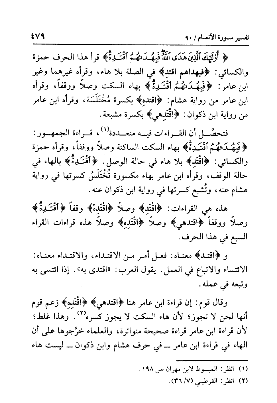 وقال قومٌ: إن قراءةَ ابنِ عامرٍ هنا {اقْتَدِهِي} {اقْتَدِهِ} زَعَمَ قومٌ أنها لَحْنٌ لاَ تجوزُ؛ لأن هاءَ السكتِ لا يجوزُ كَسْرُهُ (¬2). وهذا غَلَطٌ؛ لأن قراءةَ ابنِ عامرٍ قراءةٌ صحيحةٌ متواترةٌ، والعلماءُ خَرَّجُوهَا على أن الهاءَ في قراءةِ ابنِ عامرٍ- في حرفِ هشامٍ وابنِ ذكوانَ - ليست هاءَ