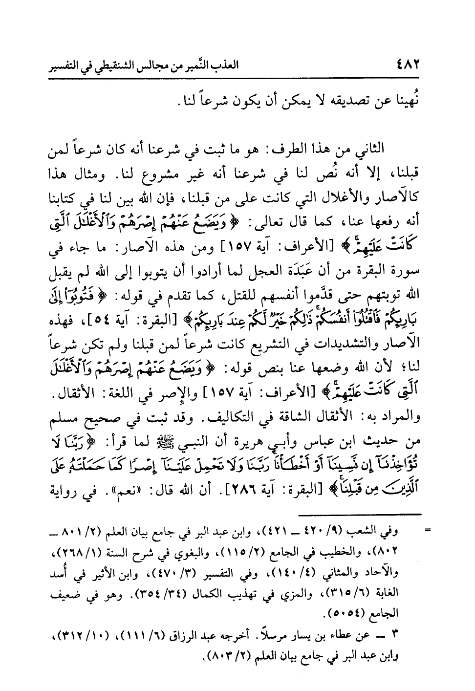 الثاني من هذا الطَّرَفِ: هو ما ثَبَتَ في شَرْعِنَا أنه كان شَرْعًا لِمَنْ قَبْلَنَا، إلا أنه نُصَّ لنا في شَرْعِنَا أنه غيرُ مشروعٍ لنا. ومثالُ هذا كالآصَارِ والأغلالِ التي كانت على مَنْ قَبْلَنَا، فإن اللَّهَ بَيَّنَ لنا في كتابِنا أنه رَفَعَهَا عَنَّا، كما قَالَ تَعَالَى: {وَيَضَعُ عَنْهُمْ إِصْرَهُمْ وَالأَغْلاَلَ الَّتِي كَانَتْ عَلَيْهِمْ} [الأعراف: آية 157] ومن هذه الآصارِ: ما جَاءَ في سورةِ البقرةِ من أَنَّ عَبَدَةَ العجلِ لَمَّا أَرَادُوا أن يَتُوبُوا إلى اللَّهِ لَمْ يَقْبَلِ اللَّهُ تَوْبَتَهُمْ حَتَّى قَدَّمُوا أنفسَهم للقتلِ، كما تَقَدَّمَ في قولِه: {فَتُوبُوا إِلَى بَارِئِكُمْ فَاقْتُلُوا أَنفُسَكُمْ ذَلِكُمْ خَيْرٌ لَّكُمْ عِنْدَ بَارِئِكُمْ} [البقرة: آية 54]،