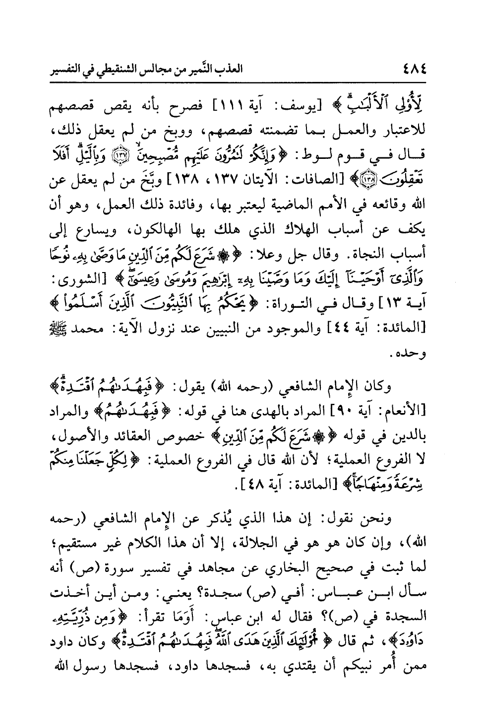 وَنَحْنُ نقولُ: إن هذا الذي يُذْكَرُ عن الإمامِ الشافعيِّ (رحمه الله)، وإن كان هُوَ هُوَ فِي الجلالةِ، إلا أن هذا الكلامَ غيرُ مُسْتَقِيمٍ؛ لِمَا ثَبَتَ في صحيحِ البخاريِّ عن مجاهدٍ في تفسيرِ سورةِ (ص) أنه سَأَلَ ابْنَ عَبَّاسٍ: أَفِي (ص) سَجْدَةٌ؟ يعني: وَمِنْ أَيْنَ أُخِذَتِ السجدةُ فِي (ص)؟ فقال له ابنُ عَبَّاسٍ: أَوَمَا تَقْرَأُ: {وَمِنْ ذُرِّيَّتِهِ دَاوُودَ} ثم قَالَ {أُولَئِكَ الَّذِينَ هَدَى اللَّهُ فَبِهُدَاهُمُ اقْتَدِهْ} وكان دَاوُدُ مِمَّنْ أُمِرَ نَبِيُّكُمْ أن يقتديَ به، فَسَجَدَهَا داودُ، فَسَجَدَهَا رسولُ اللَّهِ