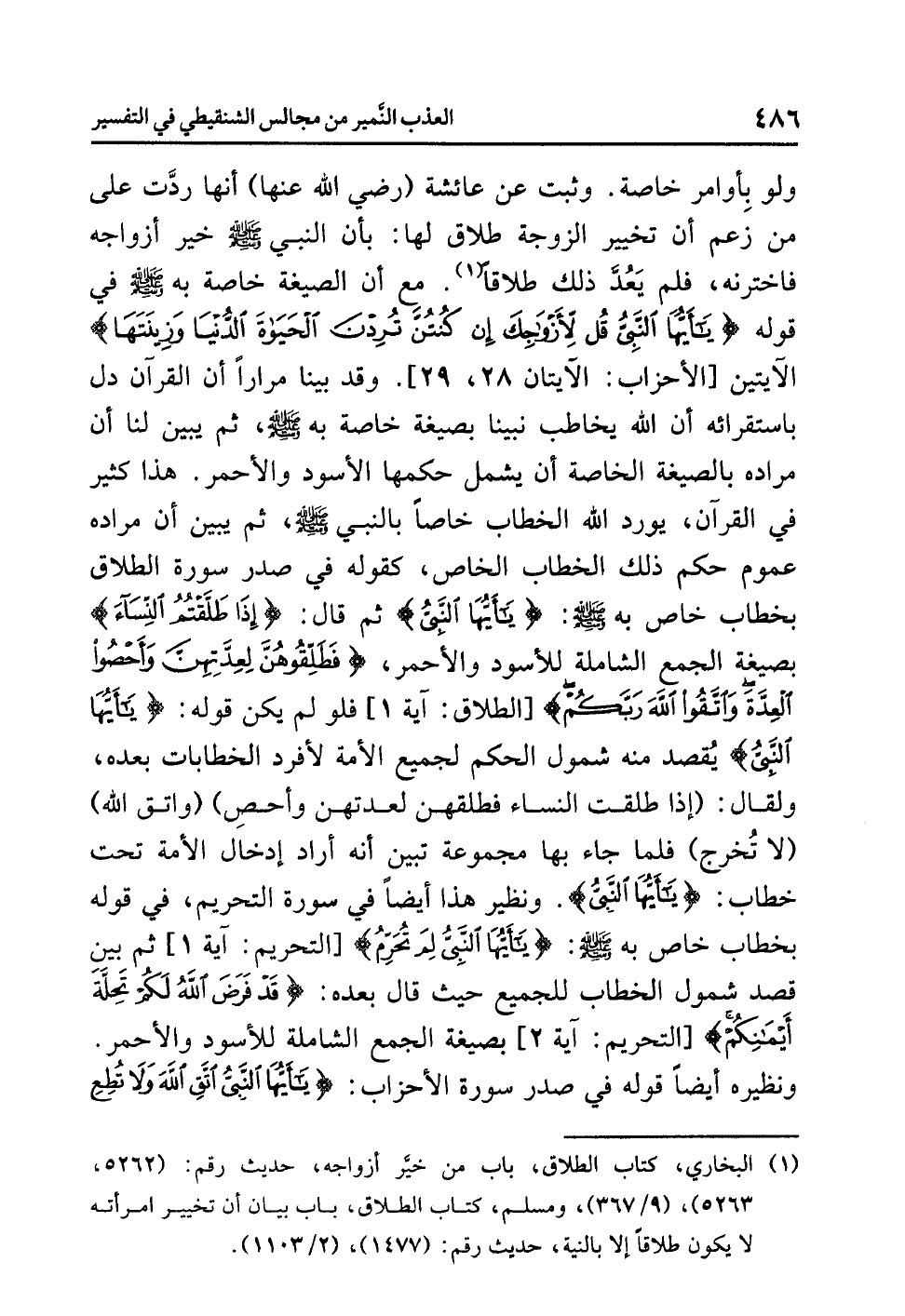 وَثَبَتَ عن عائشةَ (رضي الله عنها) أنها رَدَّتْ على مَنْ زَعَمَ أن تخييرَ الزوجةِ طلاقٌ لها: بأن النبيَّ - صلى الله عليه وسلم - خَيَّرَ أزواجَه فَاخْتَرْنَهُ، فلم يَعُدَّ ذلك طَلاَقًا (¬1) مع أن الصيغةَ خاصةٌ به - صلى الله عليه وسلم - في قولِه {يَا أَيُّهَا النَّبِيُّ قُل لِّأَزْوَاجِكَ إِنْ كُنتُنَّ تُرِدْنَ الْحَيَاةَ الدُّنْيَا وَزِينَتَهَا} [الأحزاب: الآية 28]. وقد بَيَّنَّا مِرَارًا أن القرآنَ دَلَّ باستقرائِه أَنَّ اللَّهَ يُخَاطِبُ نَبِيَّنَا بصيغةٍ خاصةٍ به - صلى الله عليه وسلم -، ثم يُبَيِّنُ لنا أن مرادَه بالصيغةِ الخاصةِ أن يشملَ حُكْمُهَا الأسودَ والأحمرَ. هذا كثيرٌ في القرآنِ، يُورِدُ اللَّهُ الخطابَ خَاصًّا بالنبيِّ - صلى الله عليه وسلم -، ثم يُبَيِّنُ أن مرادَه عمومُ حكمِ ذلك الخطابِ الخاصِّ، كقولِه في صدرِ سورةِ الطلاقِ بخطابٍ خَاصٍّ بِهِ - صلى الله عليه وسلم -: {يَا أَيُّهَا النَّبِيُّ} ثم قَالَ: {إِذَا طَلَّقْتُمُ النَّسَاءَ} بصيغةِ الجمعِ الشاملةِ للأَسْوَدِ والأَحْمَرِ، {فَطَلِّقُوهُنَّ لِعِدَّتِهِنَّ وَأَحْصُوا الْعِدَّةَ وَاتَّقُوا اللَّهَ رَبَّكُمْ} [الطلاق: آية1] فلو لَمْ يكن قولُه: {يَا أَيُّهَا النَّبِيُّ} يُقْصَدُ منه شمولُ الحكمِ لجميعِ الأمةِ لأَفْرَدَ الخطاباتِ بَعْدَهُ، وَلَقَالَ: (إذا طَلَّقْتَ النساءَ فَطَلِّقْهُنَّ لعدتهن وَأَحْصِ) (وَاتَّقِ اللَّهَ) (لا تُخرج) فلما جاء بها مجموعةً تَبَيَّنَ أنه أَرَادَ إدخالَ الأمةِ تحتَ خطابِ: {يَا أَيُّهَا النَّبِيُّ} ونظيرُ هذا أيضًا في سورةِ التحريمِ، في قولِه بخطابٍ خَاصٍّ به - صلى الله عليه وسلم -: {يَا أَيُّهَا النَّبِيُّ لِمَ تُحَرِّمُ} [التحريم: آية 1]، ثم بَيَّنَ قصدَ شمولِ الخطابِ للجميعِ حيث قال بعدَه: {قَدْ فَرَضَ اللَّهُ لَكُمْ تَحِلَّةَ أَيْمَانِكُمْ} [التحريم: آية 2] بصيغةِ الجمعِ الشاملةِ للأَسْوَدِ والأَحْمَرِ.