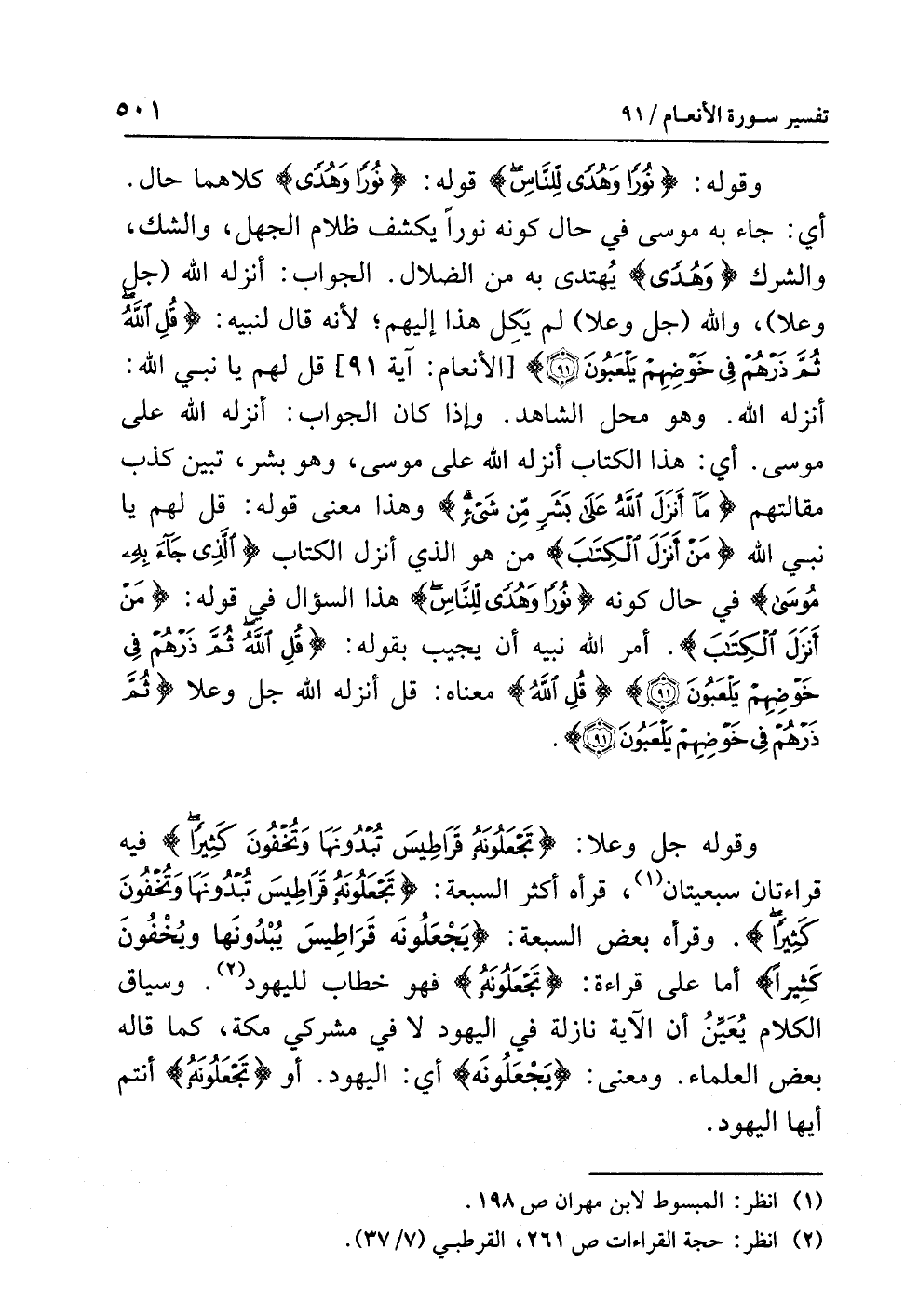 وقولُه: {نُورًا وَهُدًى لِّلنَّاسِ} قولُه: {نُورًا وَهُدًى} كِلاَهُمَا حَالٌ. أي: جَاءَ به مُوسَى في حالِ كونِه نُورًا يكشفُ ظلامَ الجهلِ وَالشَّكِّ والشركِ {وَهُدًى} يُهْتَدَى بِهِ مِنَ الضَّلاَلِ. الجوابُ: أَنْزَلَهُ اللَّهُ (جل وعلا)، وَاللَّهُ (جل وعلا) لم يَكِلْ هذا إليهم؛ لأنه قَالَ لِنَبِيِّهِ: {قُلِ اللَّهُ ثُمَّ ذَرْهُمْ فِي خَوْضِهِمْ يَلْعَبُونَ} [الأنعام: آية 91] قُلْ لَهُمْ يا نَبِيَّ اللَّهِ: أَنْزَلَهُ اللَّهُ. وهو محلُّ الشَّاهِدِ. وإذا كان الجوابُ: أَنْزَلَهُ اللَّهُ على مُوسَى. أَيْ: هذا الكتابُ أَنْزَلَهُ اللَّهُ على مُوسَى، وهو بَشَرٌ، تَبَيَّنَ كَذِبُ مَقَالَتِهِمْ: {مَا أَنْزَلَ اللَّهُ عَلَى بَشَرٍ مِّنْ شَيْءٍ} وهذا معنَى قولِه: قُلْ لَهُمْ يَا نَبِيَّ اللَّهِ: {مَنْ أَنْزَلَ الْكِتَابَ} مَنْ هُوَ الذي أَنْزَلَ الكتابَ {الَّذِي جَاء بِهِ مُوسَى} في حالِ كونِه {نُورًا وَهُدًى لِّلنَّاسِ} هذا السؤالُ في قولِه: {مَنْ أَنْزَلَ الْكِتَابَ}. أمر الله نبيه أن يجيب بقوله: {قُلِ اللَّهُ ثُمَّ ذَرْهُمْ فِي خَوْضِهِمْ يَلْعَبُونَ} {قُلِ اللَّهُ} معناه: قُلْ أَنْزَلَهُ اللَّهُ جل وعلا {ثُمَّ ذَرْهُمْ فِي خَوْضِهِمْ يَلْعَبُونَ}.