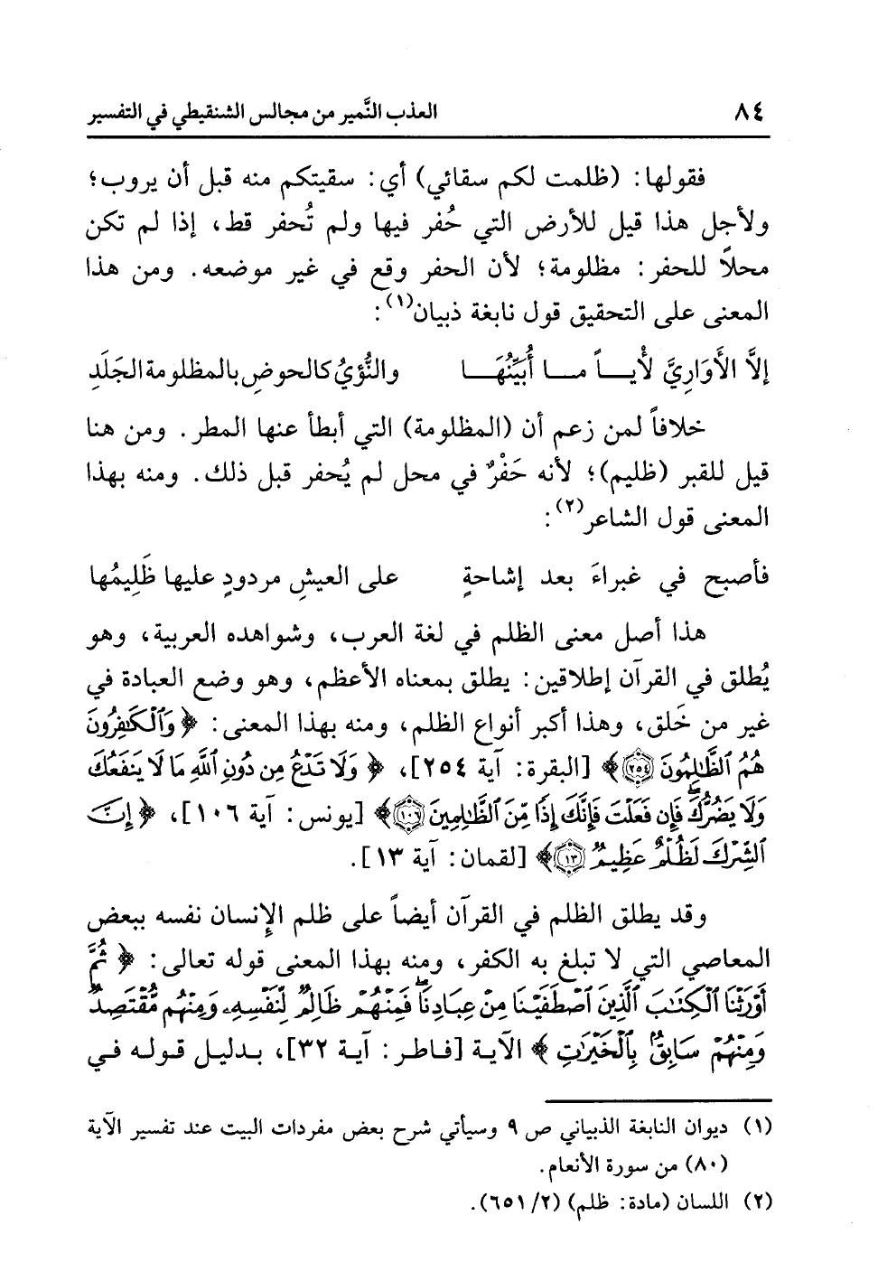 هذا أصلُ معنى الظلمِ في لغةِ العربِ، وشواهدِه العربيةِ، وهو يُطْلَقُ في القرآنِ إِطْلاَقَيْنِ: يُطْلَقُ بمعناه الأعظمِ، وهو وضعُ العبادةِ في غيرِ مَنْ خَلَقَ، وهذا أكبرُ أنواعِ الظلمِ، ومنه بهذا المعنى: {وَالْكَافِرُونَ هُمُ الظَّالِمُونَ} [البقرة: آية 254]، {وَلاَ تَدْعُ مِن دُونِ اللَّهِ مَا لاَ يَنْفَعُكَ وَلاَ يَضُرُّكَ فَإِنْ فَعَلْتَ فَإِنَّكَ إِذًا مِّنَ الظَّالِمِينَ} [يونس: آية 106]، {إِنَّ الشِّرْكَ لَظُلْمٌ عَظِيمٌ} [لقمان: آية 13].