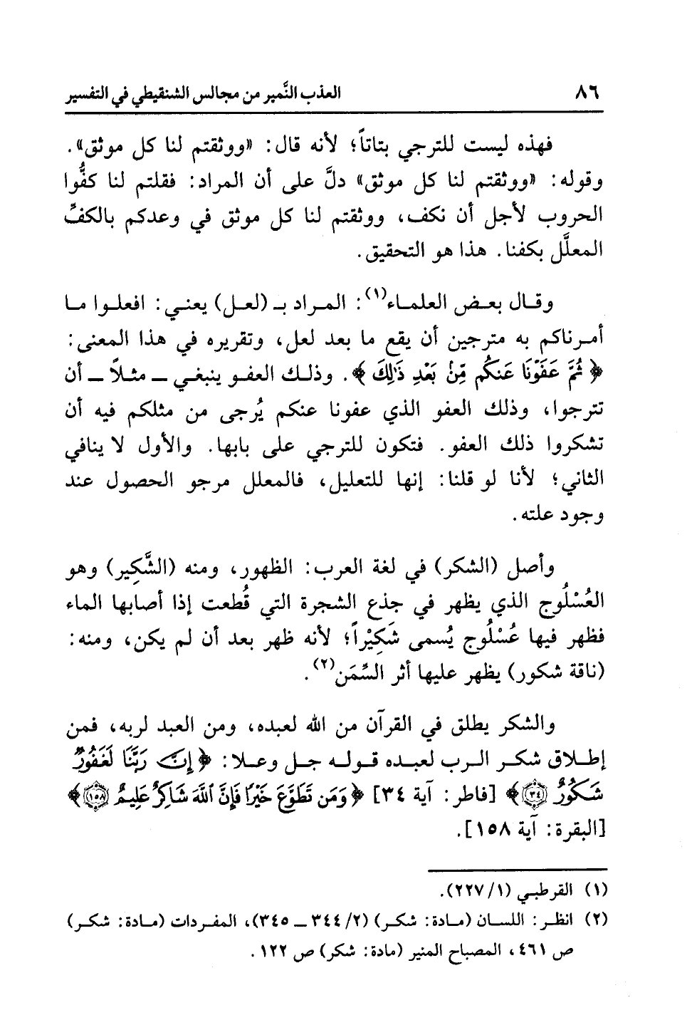 (¬2) انظر: اللسان (مادة: شكر) (2/ 344 - 345)، المفردات (مادة: شكر) ص461، المصباح المنير (مادة: شكر) ص122.