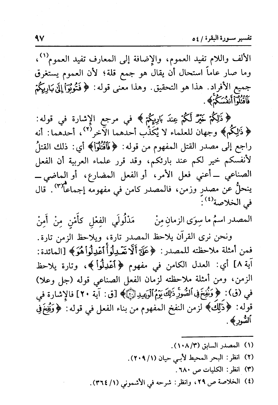 {ذَلِكُمْ خَيْرٌ لَّكُمْ عِندَ بَارِئِكُمْ} في مرجعِ الإشارةِ في قولِه: {ذَلِكُمْ} وجهانِ للعلماءِ لا يُكَذِّبُ أَحَدُهُمَا الآخَرَ (¬2)، أحدُهما: أنه راجعٌ إلى مصدرِ القتلِ المفهومِ من قولِه: {فَاقْتُلُوا} أي: ذلك القتلُ لأنفسكم خيرٌ لكم عند بارئكم، وقد قَرَّرَ علماءُ العربيةِ أن الفعلَ الصناعيَّ -أعني فعلَ الأمرِ، أو الفعلَ المضارعَ، أو الماضيَ- ينحلُّ عن مصدرٍ وزمنٍ، فالمصدرُ كامنٌ في مفهومِه إجماعًا (¬3). قالَ في الخلاصةِ (¬4):