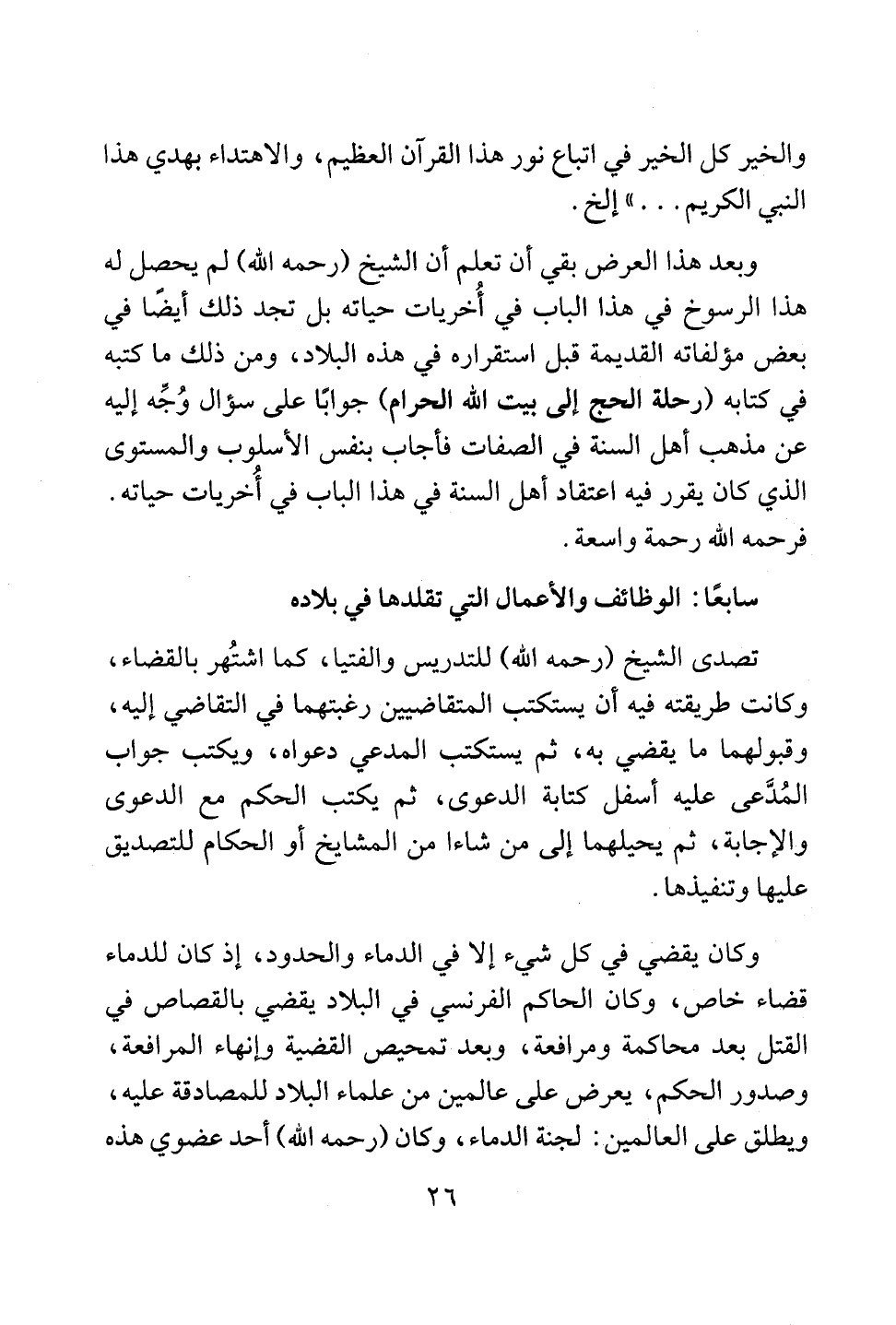 وكان يقضي في كل شيء إلا في الدماء والحدود، إذ كان للدماء قضاء خاص، وكان الحاكم الفرنسي في البلاد يقضي بالقصاص في القتل بعد محاكمة ومرافعة، وبعد تمحيص القضية وإنهاء المرافعة، وصدور الحكم، يعرض على عالمين من علماء البلاد للمصادقة عليه، ويطلق على العالمين: لجنة الدماء، وكان (رحمه الله) أحد عضوي هذه