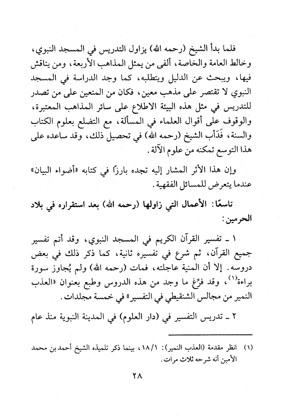 1 - تفسير القرآن الكريم في المسجد النبوي، وقد أتم تفسير جميع القرآن، ثم شرع في تفسيره ثانية، كما ذكر ذلك في بعض دروسه. إلا أن المنية عاجلته، فمات (رحمه الله) ولم يُجاوز سورة براءة (¬1)، وقد فرِّغ ما وجد من هذه الدروس وطبع بعنوان "العذب النمير من مجالس الشنقيطي في التفسير" في خمسة مجلدات.