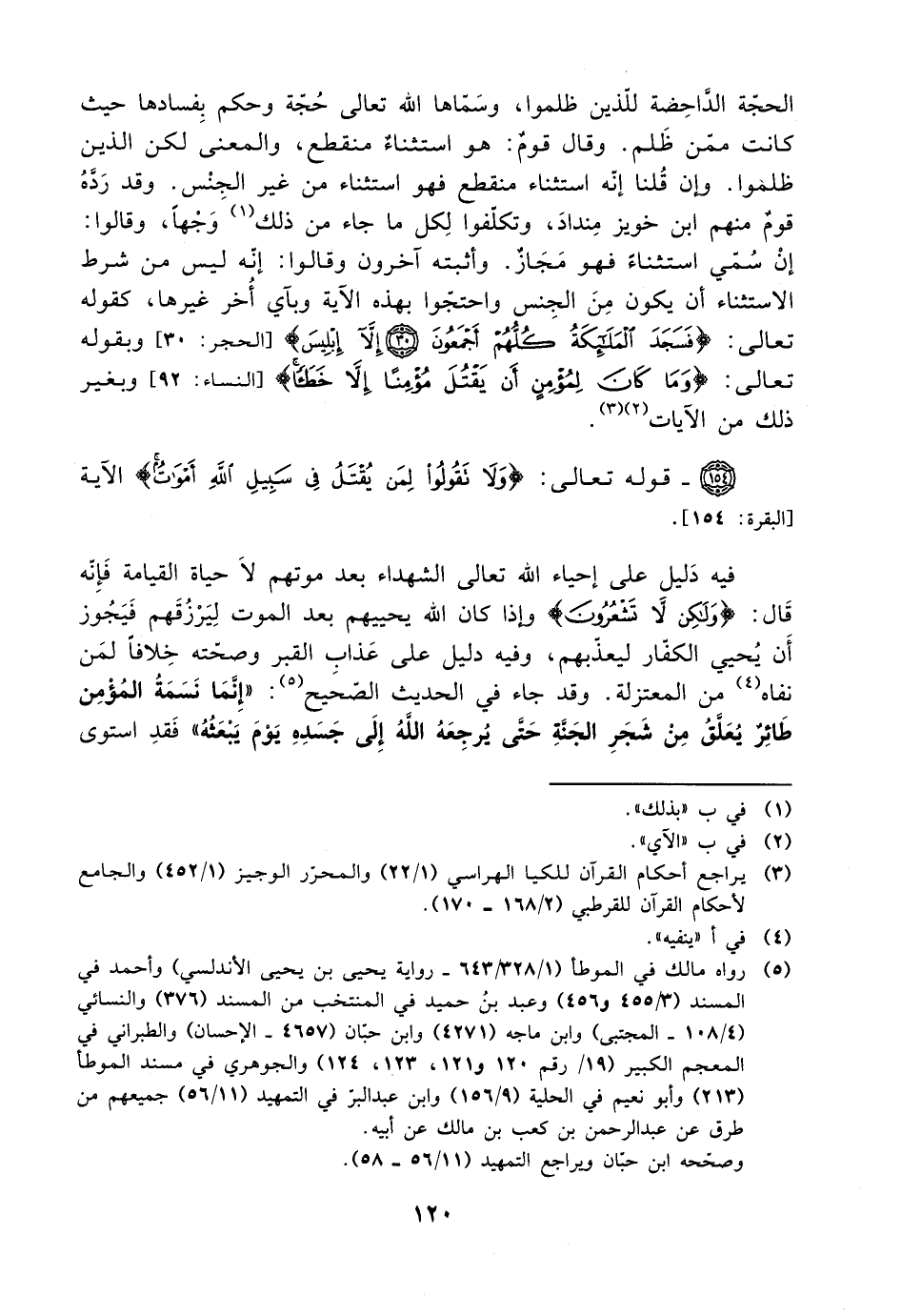 فيه دليل على إحياء الله تعالى الشهداء بعد موتهم لا حياة القيامة، فإنه قال: {ولكن لا تشعرون} وإذا كان الله يحيييهم بعد الموت ليرزقهم فيجوز أن يحيي المفار ليعذبهم، وفيه دليل على عذاب القبر وصحته خلافًا لمن نفاه من المعتزلة. وقد جاء في الححديث الصحيح: ((إنما نسمة المؤمن طائر يعلق من شجر الجنة حتى يرجعه الله إلى جسده يوم يبعثه)) فقد استوى