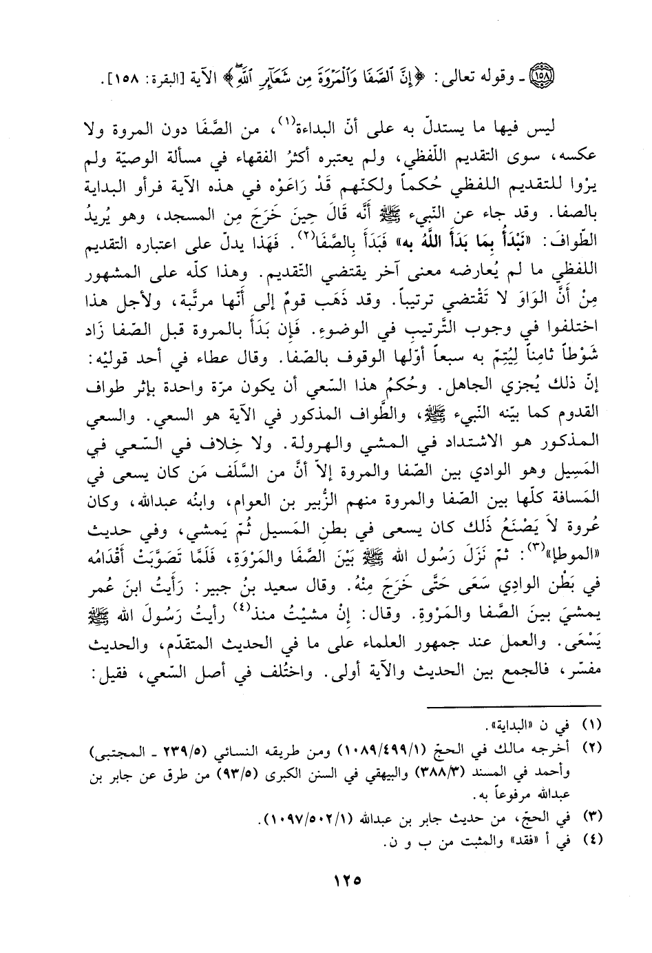 ليس فيها ما يستدل به على أن البداءة من الصفا دون المروة ولا عكسه، سوى التقديم اللفظي، ولم يعتبره أكثر الفقهاء في مسألة الوصية ولم يروا للتقديم اللفظي حكمًا، ولكنهم قد راعوه في هذا الآية فرأوا البداية بالصفا. وقد جاء عن النبي صلى الله عليه وسلم أنه قال حين خرج من المسجد، وهو يريد الطواف: ((نبدأ بما بدأ الله به)) فبدأ بالصفا. فهذا يدل على اعتباره التقديم اللفظي ما لم يعارضه معنى آخر يقتضي التقديم, هذا كله على المشهور من أن الواو لا تقتضي ترتيبًا. وقد ذهب قوم إلى أنها مرتبة، ولأجل هذا اختلفوا في وجوب الترتيب في الوضوء. فإن بدأ بالمروة قبل الصفا زاد شوطًا ثامنًا ليتم به سبعًا أولها الوقوف بالصفا. وقال عطاء في أحد قوليه: إن ذلك يجزي الجاهل. وحكم هذا السعي أن يكون مرة واحدة بإثر طواف القدوم كما بينه النبي صلى الله عليه وسلم، والطواف المذكور في الآية هو السعي. والسعي المذكور هو الاشتداد في المشي والهرولة. ولا خلاف في السعي في المسافة كلها بين الصفا والمروة، منهم الزبير بن العوام، وابنه عبد الله، وكان عروة لا يصنع ذلك، كان يسعى في بطن المسيل ثم يمشي، وفي حديث ((الموطأ)): نزل رسول الله صلى الله عليه وسلم بين الصفا والمروة، فلما تصوبت أقدامه في بطن الوادي سعى حتى خرج منه. وقال سعيد بن جبير: رأيت ابن عمر يمشي بين الصفا والمروة. وقال: إن مشيت منذ رأيت رسول الله صلى الله عليه وسلم يسعى. والعمل عند جمهور العلماء على ما في الحديث المتقدم، والحديث مفسر، فالجمع بين الحديث والآية أولى. واختلف في أصل السعي، فقيل: